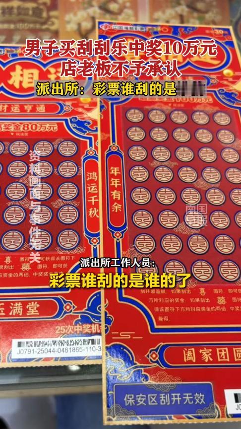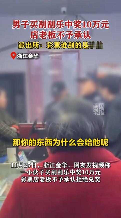 “冤不冤?”11月25日,浙江金华,一男子到彩票站买刮刮乐,由于经常来,他没有先付钱,拿起彩票就刮了一张,没想到运气爆棚,中了100000元大奖!可老板却表示,因为没付钱,所以这张彩票属于店里。网友:真是玩不起! 买彩票中大奖,相信这是很多人的梦想,毕竟这种天上掉馅饼的事情想想都美,但现实却截然相反,很多人买了好几年都还是亏本状态。而浙江的小伙好不容易中了奖,却也遇到了麻烦事。 当天晚上,小伙又来彩票店买彩票,由于自己经常来,老板在递给他彩票后并没有要求先付钱,小伙就在一旁默默刮了起来。 没想到,今天晚上他被幸运女神所眷顾,第一张彩票就中了10万元的大奖!小伙难掩心中的喜悦,开心地跳了起来,随即将这一好消息告诉了老板。 可小伙还没高兴太久,老板的一句话就浇灭了他的热情,老板表示,这张彩票还没付钱,所以不属于他的。 小伙意识到对方是想耍无赖,于是立即报了警,在民警的协调下,老板这才恋恋不舍的将彩票还给小伙,事情最终得以解决。 网友看后表示,这样的老板真是太没有格局了,照他这个意思,没付钱的中奖了可以不给,那没中奖的是不是也不需要付钱了?这是搞笑! 信息来源:《男子买刮刮乐中奖10万元,店老板不予承认,派出所:彩票谁刮的是谁的》南国早报