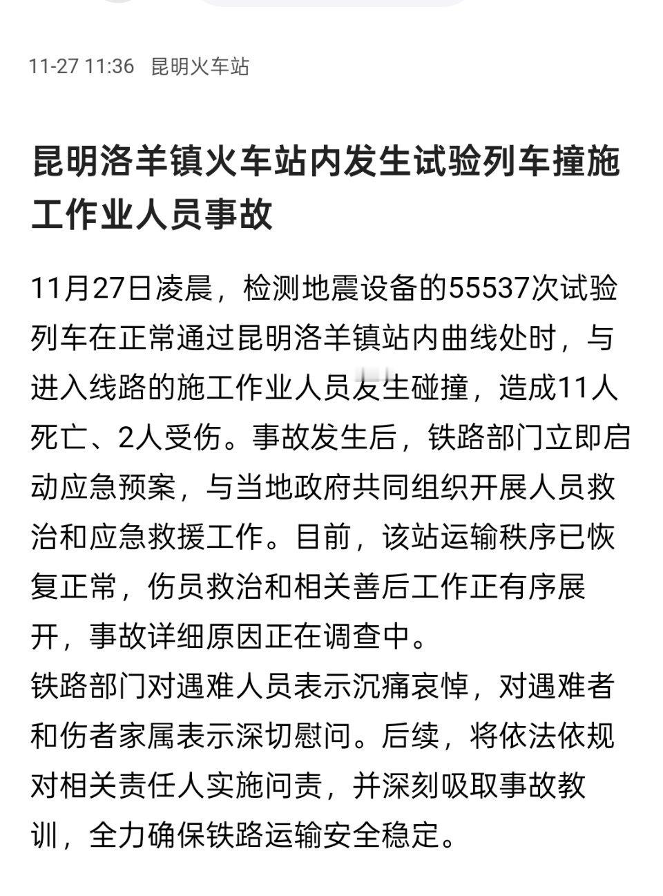 啊?这么大事故…… 昆明一火车站发生试验列车撞施工人员事故