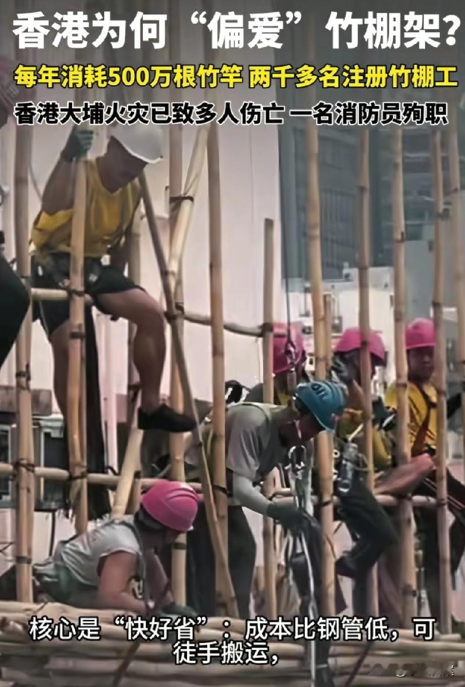 为什么香港脚手架用竹子而非钢管?不是不想换,乃是不能换、也换不了!道理很简单: 1、自然环境的限制。香港位于我国南部沿海,气候湿热、夏秋季节多台风。 竹子韧性好,上下弹动适应台风,阴干后抗霉变腐烂;钢管不仅容易锈蚀,遇到强台风天气,过刚易折,弄不好整个散架倒塌。 2、经济人文的制约。香港街巷狭窄,人口密度高,人工、仓储、环保成本皆不便宜。 竹子轻便,成本低廉,生长周期快,产出污染低,工人连扛带搭,速度迅捷;钢管产出不仅重污染,狭窄小巷中,很难用大型机械作业,仅靠人工,速度太慢,外加仓储费用,成本过高。 3、传统文化与行业垄断。竹子脚手架在香港那边也称“搭棚”,其历史非常悠久,历经数百年,目前已列入香港非物质文化遗产名录,80年代经典港片《少林搭棚大师》,里面就展现了类似的搭棚工作。 除了文化方面需要传承外,竹子脚手架在当地存在着明显商业垄断,除了工人技术需要协会认证外,公司的准入也被牢牢把控,金属棚架想挤入市场,十分困难。 这次香港大火伤亡惨烈、损失严重,竹子脚手架在火势引燃和扩张上的负面作用,大家有目共睹。 民众生命大于天!希望这次深刻教训能让人警醒,让香港能够找出更适合、更安全的户外棚架材料…… 【关注@小讼言案 ,为您分享更多精彩】 (来源:凤凰网)