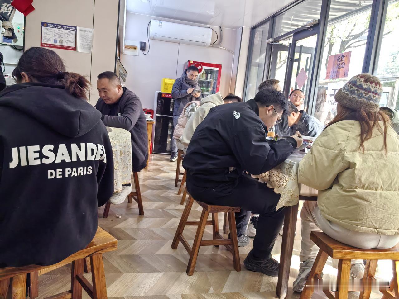 图二这一大碗面,你们猜要多少钱? 老年大学上完课,一晃又快十二点了,肚子还真饿了!今天准备继续去打卡艳姐皮肚面店。 店里照例顾客盈门,不断有人吃完离开,又不断有人进来,不知今天得等多久才有的吃。 店面不大,大大小小才六个桌子,除了一张圆台可以多坐几个人,有两个可以坐八个人的,其他基本是四个人一桌的。 自从今年夏天苏超爆火以后,这家常州主教练樊毅爱人开的皮肚面店,也生意与日俱增的兴隆。 厨房里有六七人在忙,有的负责点单,有的负责洗菜,有的负责端面……店门口还贴着招工启事。 真是万万想不到,苏超的影响力如此之大,这也是名人效应吧。不过她家的面,味道也确实鲜美好吃。 感谢苏超,让我们也有幸知道并吃到这大碗的好吃的南京皮肚面。