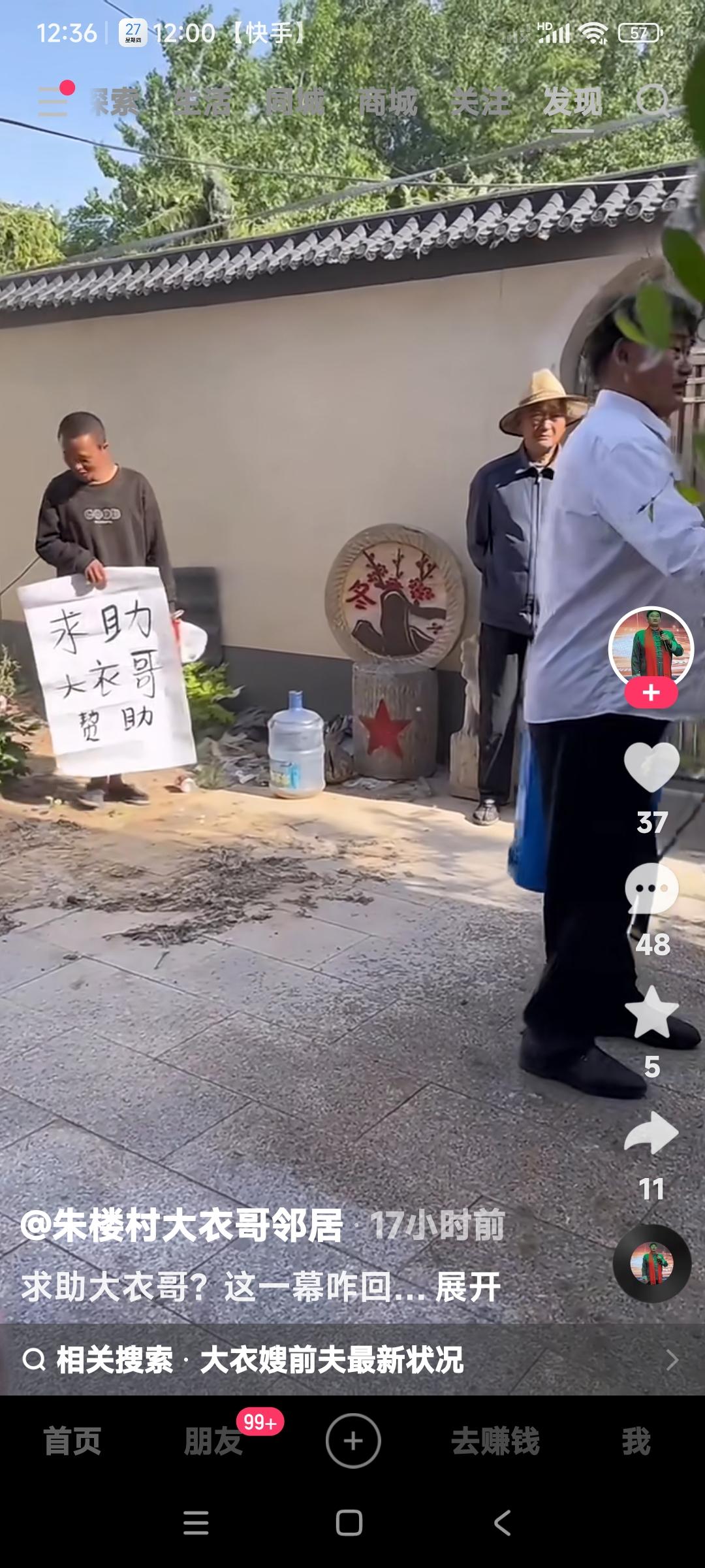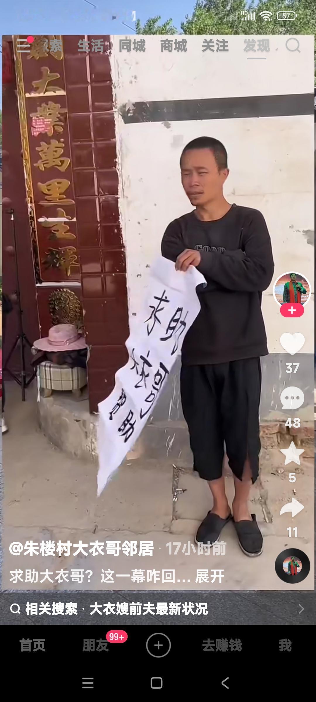 大衣哥朱之文家门前是真不消停啊。 门前又来一个求助者。 瞅那面相,是一个中壮年,也不像有残疾的,有毛病人。 但是他没文化是肯定的,因为求助板上有错别字。 他没毛病找政府没有用,找大明星,马云之类的,他摸不着门儿。 所以只能上朱之文家来碰碰运气吧。 这帮人儿在他心里想着大衣哥如果开开恩,他们还兴许能要着钱。 你们说大衣哥能开恩不?