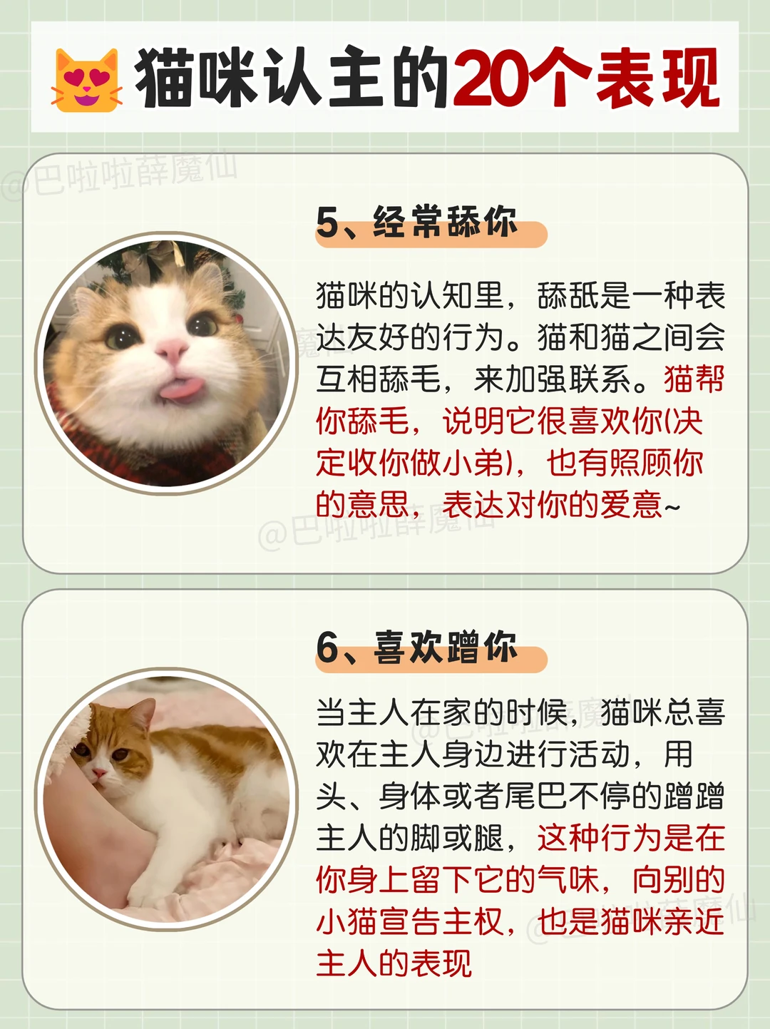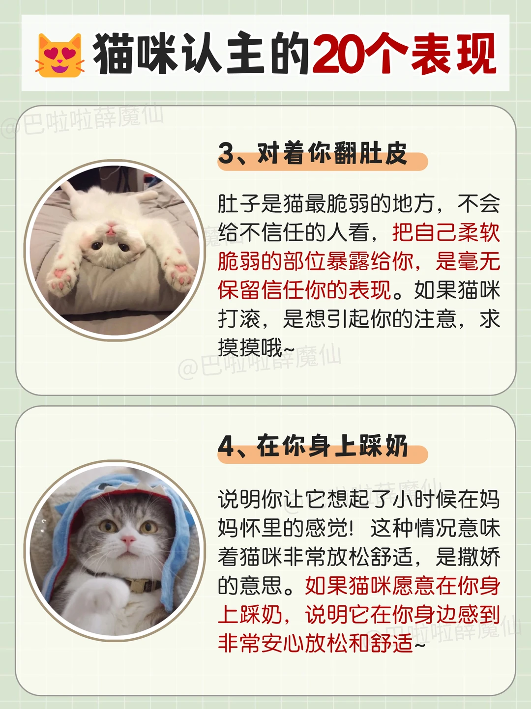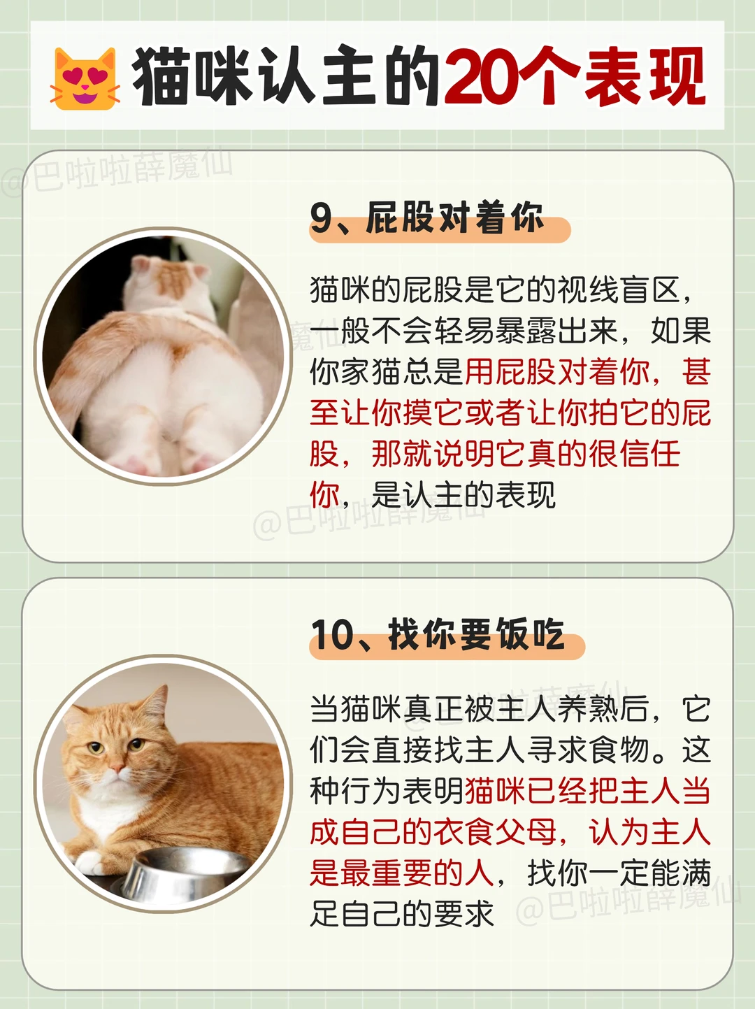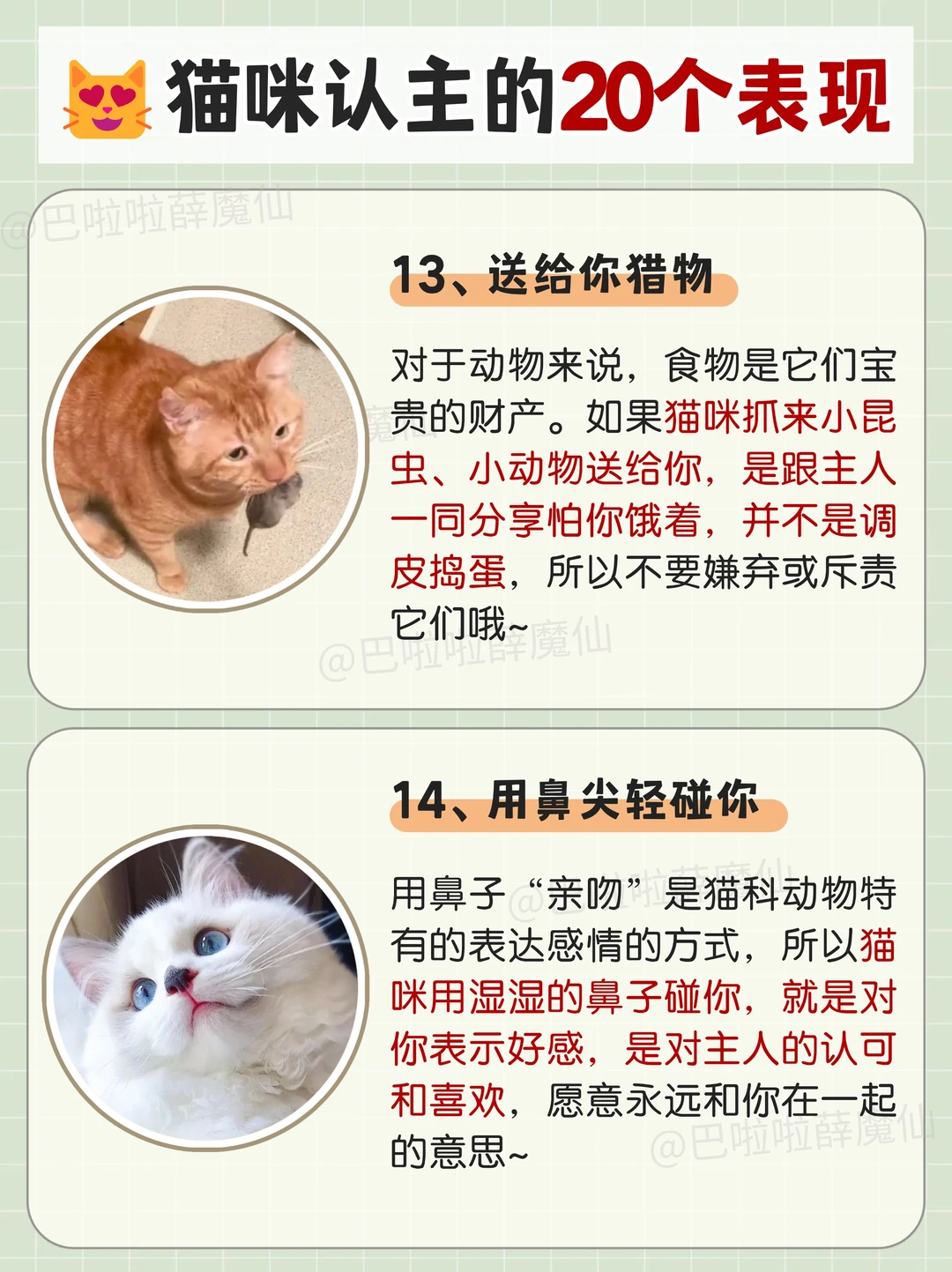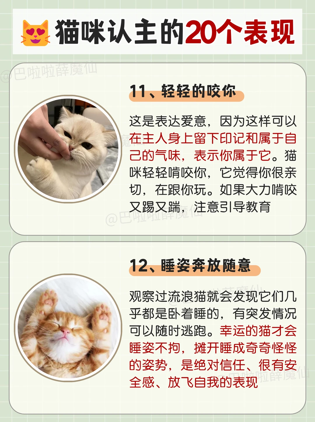 猫猫“把你当做主人”的20种表现,中10个以上,这猫没白疼! ①对着你打呼噜 ②跟你一起睡觉 ③对着你翻肚皮 ④在你身上踩奶 ⑤经常舔你 ⑥喜欢蹭你 ⑦当你的跟屁虫 ⑧对你缓慢眨眼 ⑨屁股对着你 ⑩找你要饭吃 ①①轻轻的咬你 ①②睡姿奔放随意 ①③送给你猎物 ①④用鼻尖轻碰你 ①⑤经常不埋屎 ①⑥蹲门口等你回家 ①⑦对你事事有回应 ①⑧随便摸不生气 ①⑨共情能力很强 ②0喜欢你的味道 我的治愈系猫咪不懂就问有问必答我家宠物好可爱新手养猫养猫经验分享猫咪日常猫咪的迷惑行为养宠手册吸猫猫咪行为学猫咪认主