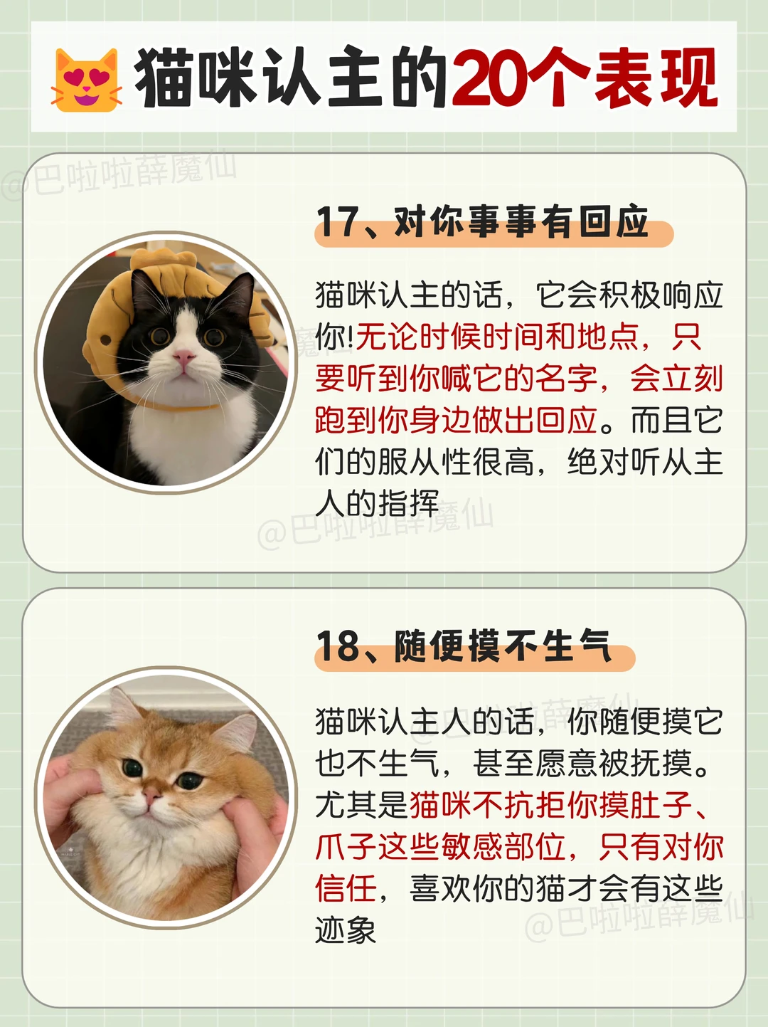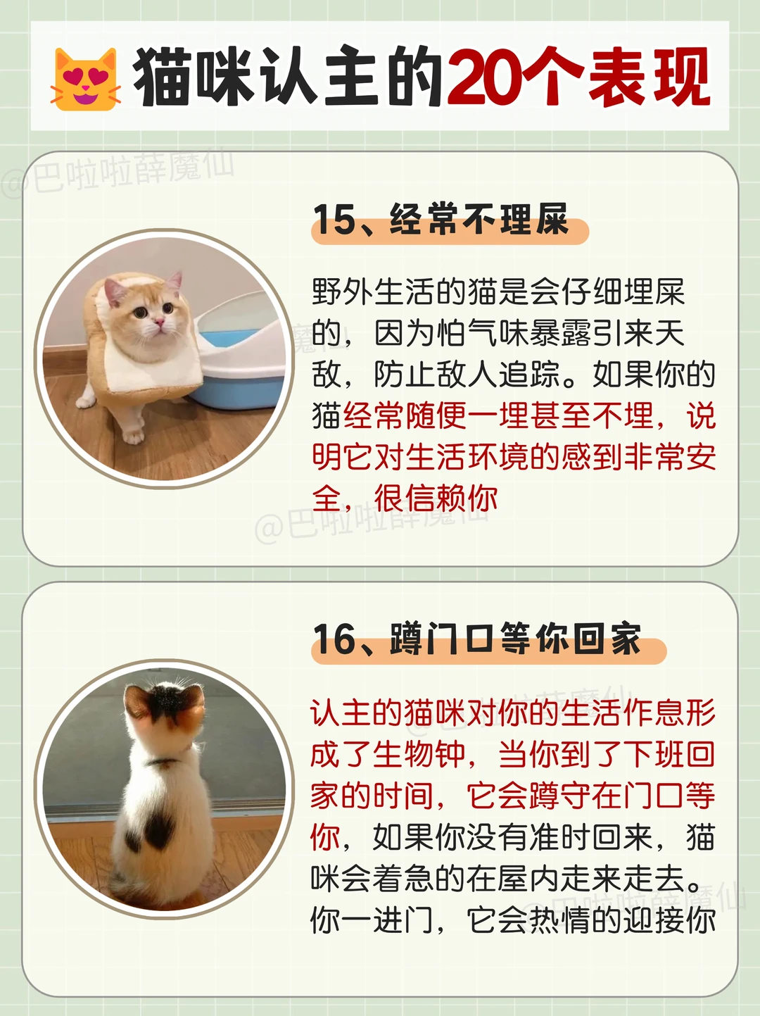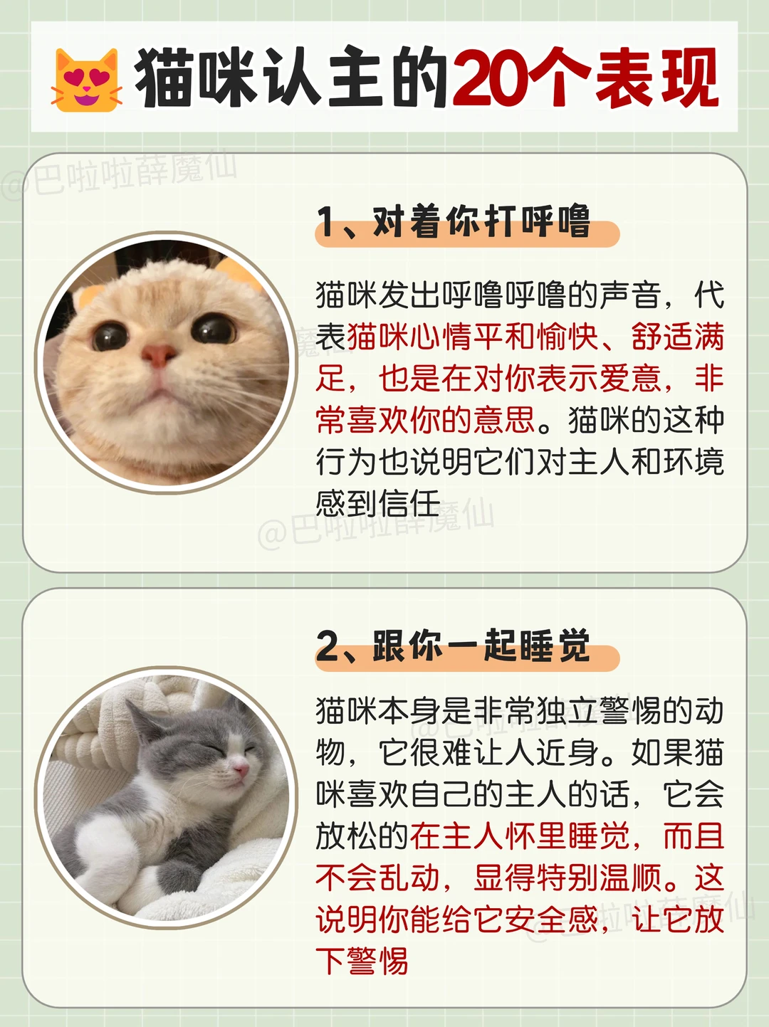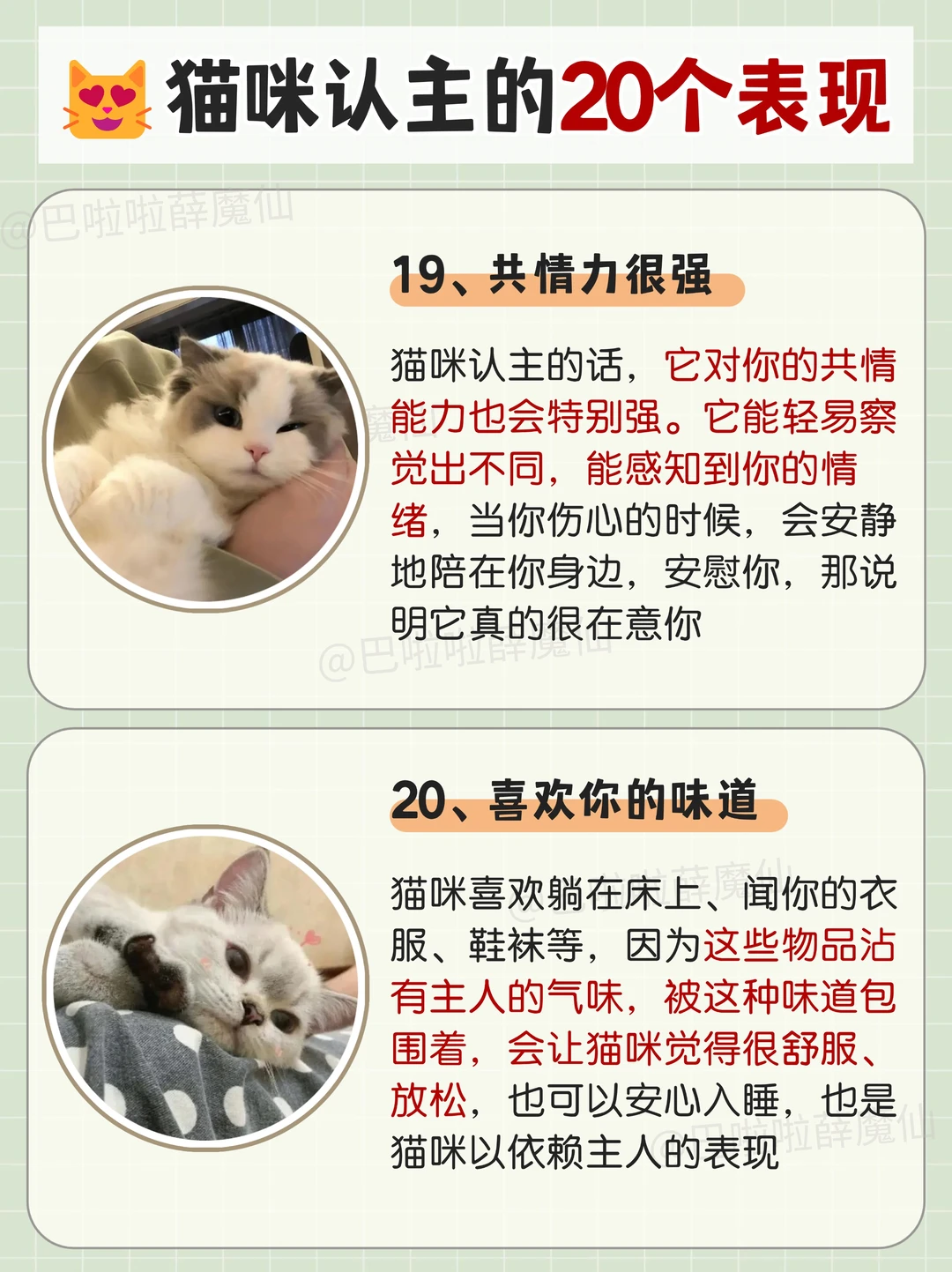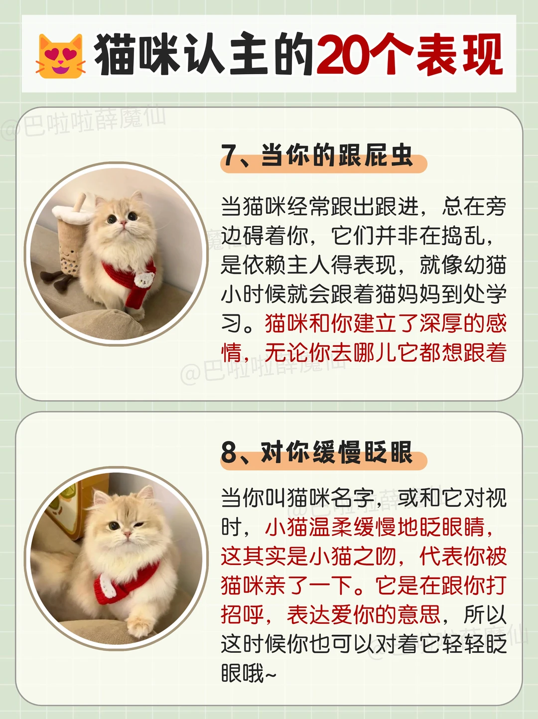 猫猫“把你当做主人”的20种表现,中10个以上,这猫没白疼! ①对着你打呼噜 ②跟你一起睡觉 ③对着你翻肚皮 ④在你身上踩奶 ⑤经常舔你 ⑥喜欢蹭你 ⑦当你的跟屁虫 ⑧对你缓慢眨眼 ⑨屁股对着你 ⑩找你要饭吃 ①①轻轻的咬你 ①②睡姿奔放随意 ①③送给你猎物 ①④用鼻尖轻碰你 ①⑤经常不埋屎 ①⑥蹲门口等你回家 ①⑦对你事事有回应 ①⑧随便摸不生气 ①⑨共情能力很强 ②0喜欢你的味道 我的治愈系猫咪不懂就问有问必答我家宠物好可爱新手养猫养猫经验分享猫咪日常猫咪的迷惑行为养宠手册吸猫猫咪行为学猫咪认主