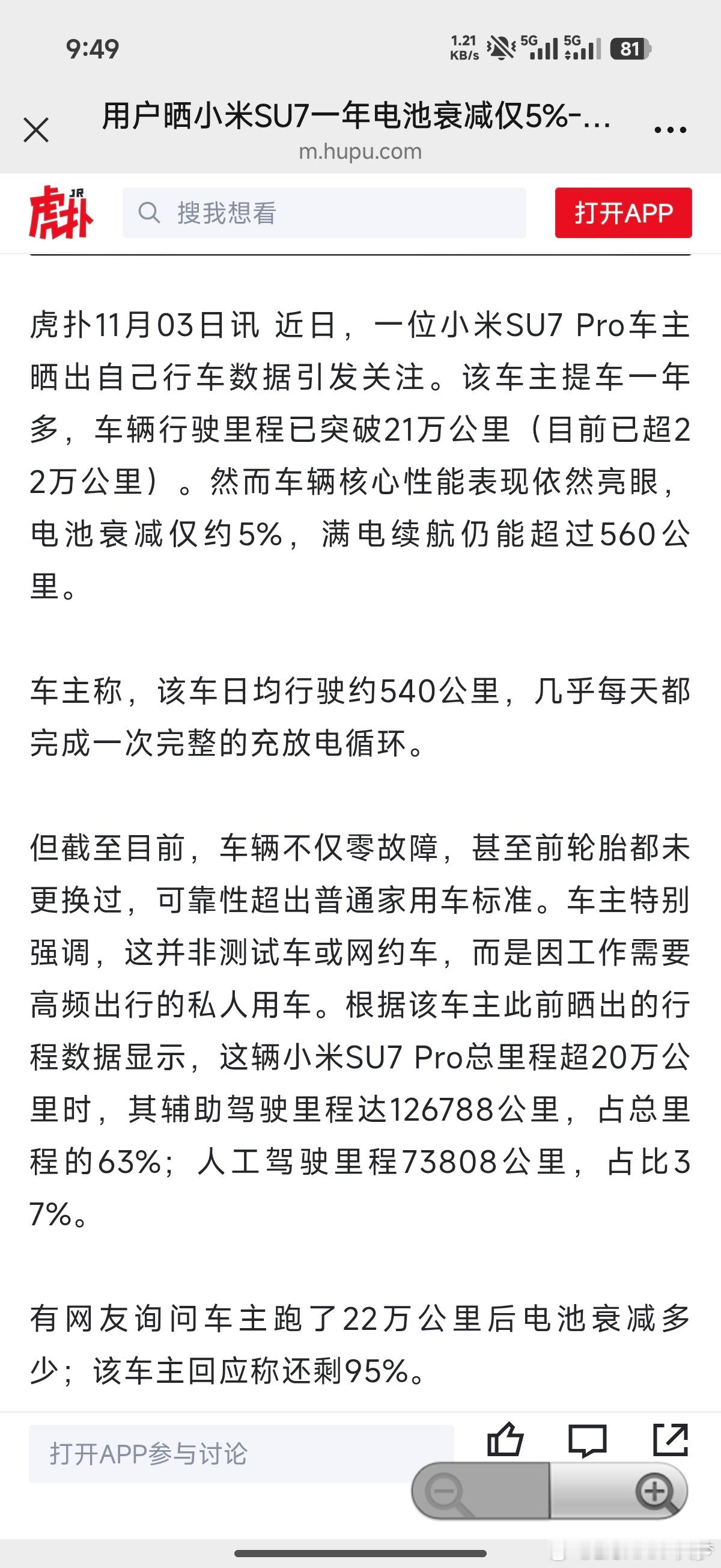 才刷到这个案例,这么好居然没怎么宣传,先来给大家总结下这台车情况:1,这位车主提车一年多左右,车型是SU7 Pro2,总里程已经超过了21万公里,每天接近要开500公里3,电池衰减仅5%,满电续航还可以超过560公里这就是做长测的意义,因为安全、续航就是车最基本的素质,SU7这块是没得黑。