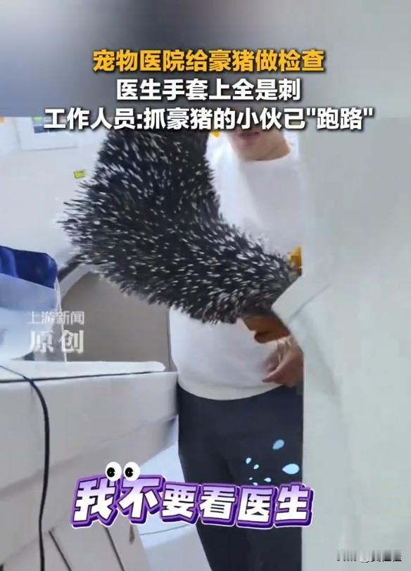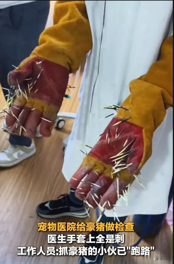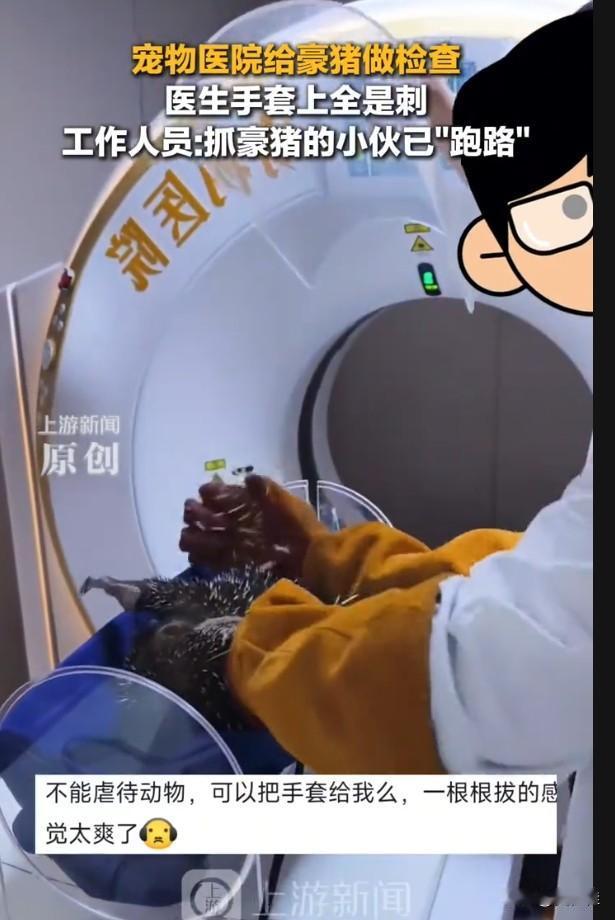 为了给豪猪做个检查,医生是真豁出去了!手套上扎得密密麻麻全是刺,看得人直咧嘴——这豪猪的“武器库”可真不是盖的。 据说负责抓豪猪的小伙早“溜了”,留下医生硬着头皮上。看这豪猪圆滚滚一身尖刺,往那儿一蜷就跟个刺球似的,医生还得小心翼翼把它往检查设备里送,每动一下都得防着“挨扎”。 这给动物做个检查,简直是跟“带刺大佬”斗智斗勇,医生这手怕是得疼好一会儿了!