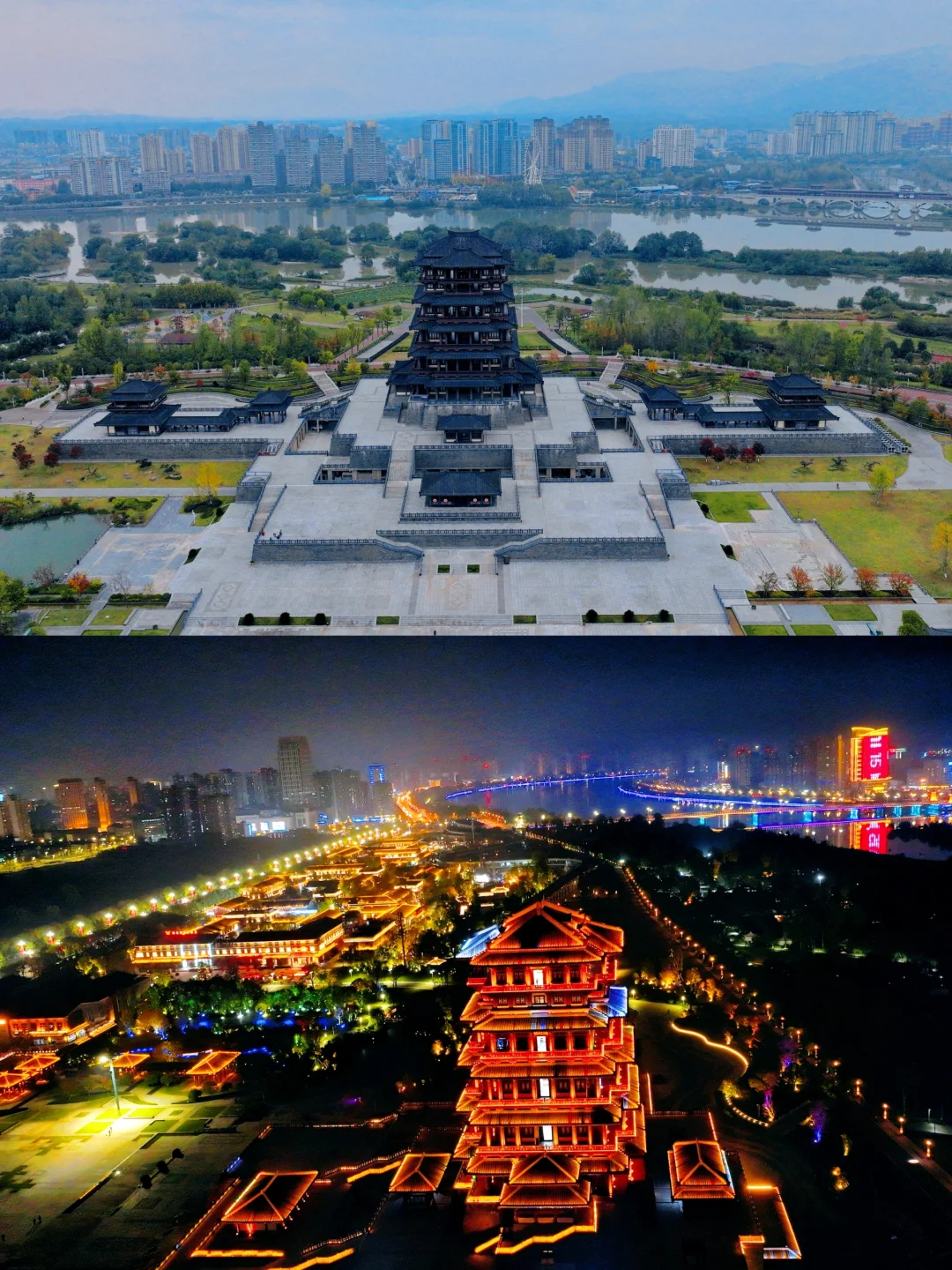 🔸天汉楼:天汉楼为外七层内九层五层翘檐仿汉代楼阁式建筑,每层楼都有不同的主题展览,顶层可俯瞰汉中城景及汉江美景,很是雄阔壮美。