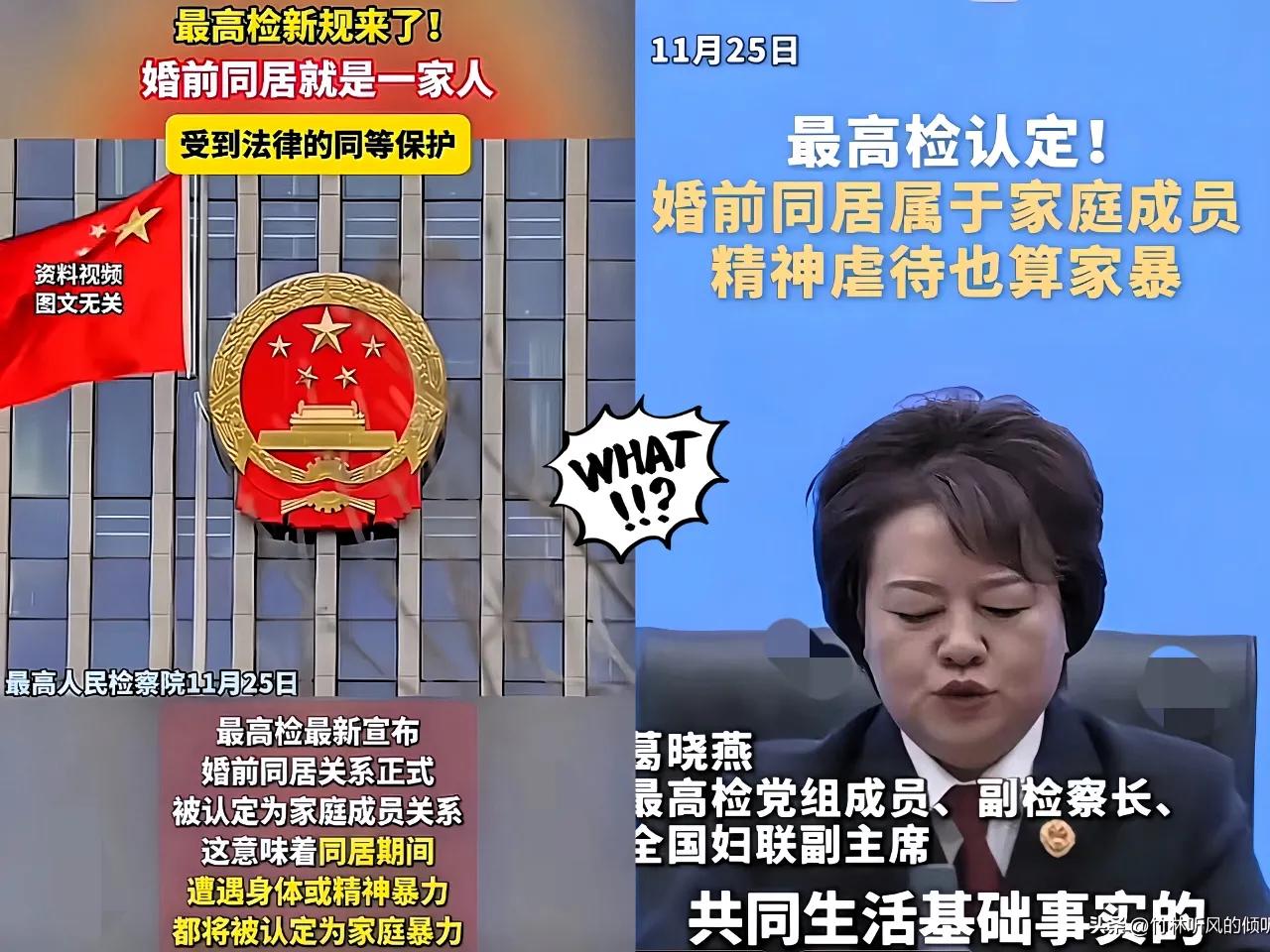 最高检认定,婚前同居属于家庭成员。 这一条的规定大大减少了婚前同居的情况。女孩保住了清白之身,男孩也不用在征婚时强调必须是处女了。 现在非婚同居太随意了,靠道德约束很难自觉遵守,同居就能分财产就能吓退这些年轻人,让渣男都负起责任,不能让结婚证成为一张废纸。 有个问题,像王校长这种情况应该如何确认?