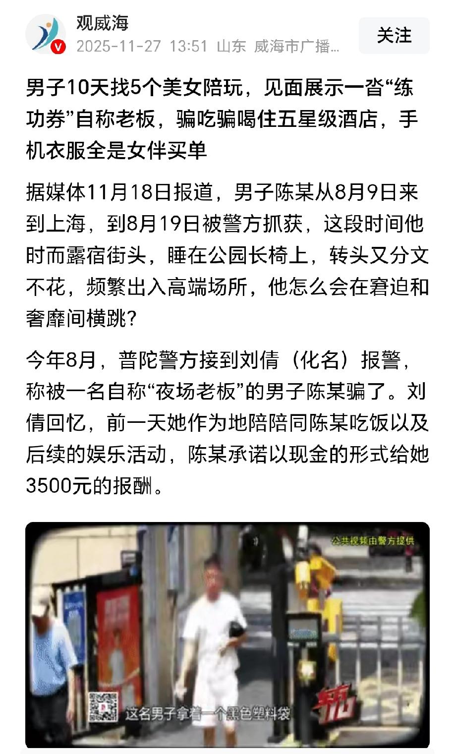 上海,男子身无分文,却在10天内找了5个不同的美女陪他出入高档场所,更不可思议的是,住酒店吃饭、买衣服买手机也都是女伴给他买单。原来,男子自称是夜场老板,每次约见女伴,都拿出一沓“现金”展示,然后找各种理由让女伴先帮忙垫付,事后他用“现金”支付高薪报酬和垫付的费用。等男子走后,女子才知道,所谓的现金竟然全是练功券。女子报警后,事情的真相让她后背发凉。 刘女士做地陪多年,她怎么也想不到,一次“高薪接单”会让自己陷入骗局,说好的报酬没拿到不说,还被骗财又骗色。 今年8月,刘女士在社交群里看到一条“日薪3500元陪玩”的订单,优厚的条件让她非常心动,当即接下这个订单。 接头人陈某自称夜场老板,包里还露出几沓百元现金,一身名牌加谈吐间的阔气,很快打消了刘女士的疑虑。 陈某拍着胸脯承诺全程开销由他承担,事后另有厚报,当天便带着刘女士出入高档餐厅和娱乐场所,派头十足。 让刘女士没想到的是,吃完饭后,陈某竟然忙着打电话谈生意,示意她先去买单。 刘女士也不好得罪陈某,只能无奈的先去买单,垫付了这笔餐费。 不仅如此,饭后逛娱乐场所,晚上入住五星级酒店,陈某都找理由让刘女士先帮忙垫付一下费用,到时候少不了她的好处。 陈某这样的大老板,肯定是不差钱的主,刘女士也没多想,一笔一笔的垫付着两人的费用开销。 为了能哄陈某开心,刘女士还主动给陈某买了礼物,给他选了一件得体的衣服,只希望能多拿一些小费。 次日,陈某提着一个黑色塑料袋赴约结酬,在刘女士家中掏出五六万“现金”。 金灿灿的钞票让刘女士彻底放下戒心,她开心的当场就要去数钱,可陈某却拦住了她。 陈某以“风水”为由,把这些现金压在刘女士床下,还提议用这笔钱作为后续开销大备用金,事后统一结算。 没等陈某离开,刘女士恰巧接到房东催租的电话,她卡上余额不足,提出用这笔钱先垫付一下房租。 一听这话,陈某突然接了个紧急电话,匆匆离去。 满心欢喜的刘女士赶紧翻开床下的袋子,准备数出交房租的钱,不料,刚数了没几张,她就发现了不对劲。 原来,这几沓现金只有表面几张是真币,里面全是印着“练功券”的假钞。 刘女士瞬间惊觉被骗,不仅高薪报酬没有了,她垫付了不少的费用也打了水漂,陈某简直是骗财又骗色,她立刻选择了报警。 警方调查发现,陈某并非什么老板,而是身无分文的骗子。 从8月9日潜入上海到19日落网,10天时间内陈某用同样手法骗了5名女性。 陈某用小号在社交群假扮中介发布高薪订单,用混有真币的练功券伪装大款,诱骗受害者为其支付酒店费、餐费,还为他购置衣物和新款手机,10天时间累计诈骗近5万元。 陈某的生活极具反差,没找到目标时露宿公园长椅,一旦得手便化身“富豪”出入高端场所。 更令人唏嘘的是,名牌大学研究生小丁因贪图小利,还帮他出借银行卡、代收中介费,案发后也被学校退学,还被公安机关采取了刑事强制措施。 《刑法》第三百一十二条规定:明知是犯罪所得及其产生的收益而予以窝藏、转移、收购、代为销售或者以其他方法掩饰、隐瞒的,处三年以下有期徒刑、拘役或者管制,并处或者单处罚金。 小丁作为名牌大学研究生,具备正常认知和判断能力。 他提供银行卡、代收费用的行为,为陈某转移诈骗赃款、掩盖犯罪痕迹提供了关键帮助,已经构成掩饰、隐瞒犯罪所得罪,这一次难逃刑责。 8月19日,警方在高档商场抓获陈某,彼时他身上的名牌和手机全是受害者买单的“战利品”。 目前,陈某因涉嫌诈骗罪被批准逮捕。 《刑法》第二百六十六条规定:诈骗公私财物,数额较大的,处三年以下有期徒刑、拘役或者管制,并处或者单处罚金。 陈某身无分文却刻意伪装成夜场老板,以虚假承诺骗取财物,无任何履约意愿。 他通过社交群发布虚假“高薪陪玩”订单,用混有真币的练功券冒充巨款骗取信任,再以各种理由诱骗刘女士等5名被害人垫付费用、购买物品,累积诈骗5万元。 根据诈骗罪的司法解释,陈某已达到“数额较大”标准,依法应在三年以下有期徒刑、拘役或者管制幅度内量刑。 天下没有免费的午餐,突如其来的优厚条件背后往往暗藏骗局。刘女士被陈某表面的阔气派头和虚假财富所迷惑,终究因贪念落入陈某的圈套。