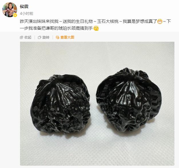 侯震晒出了妹妹送给自己的生日礼物!这份礼物还是蛮有心意,蛮贵重的,一对玉石核桃。送礼,就要投其所好,侯震对盘核桃,那是相当喜欢的。郭德纲直播的时候,侯震就拿着刷子,在忙活着,刷他的核桃。“擦擦擦”的声音,影响到郭德纲的讲话,两次把刷子从侯震那里夺走。这不,妹妹送的核桃,让侯震心愿了却。接下来,侯震又找到了新的目标,开始惦记于谦的琥珀长颈鹿了。不怕贼偷,就怕贼惦记,接下来就等侯震的晒照了。