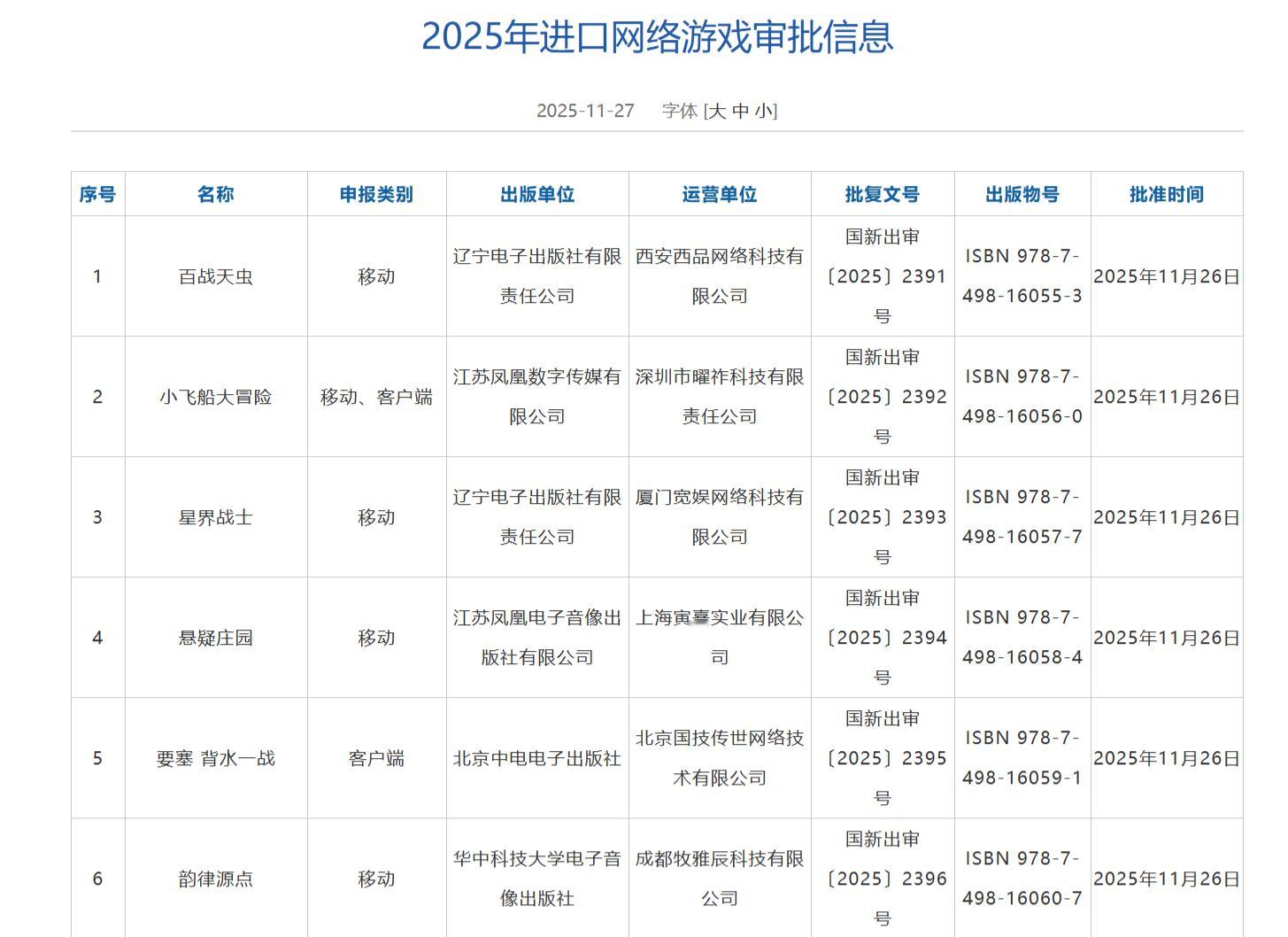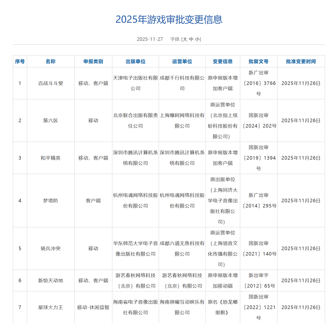 【11月版号公开:184款游戏过审,含1款主机端游戏】11月游戏版号公开,178 款国产游戏、6款进口游戏,其中包含一款主机端游戏为PS5平台的《星砂岛》。同时,2025年游戏审批变更信息也进行了更新,共有7款游戏提出变更,腾讯旗下《和平精英》提交申报增加客户端版本。178款国产游戏获批11月游戏版号