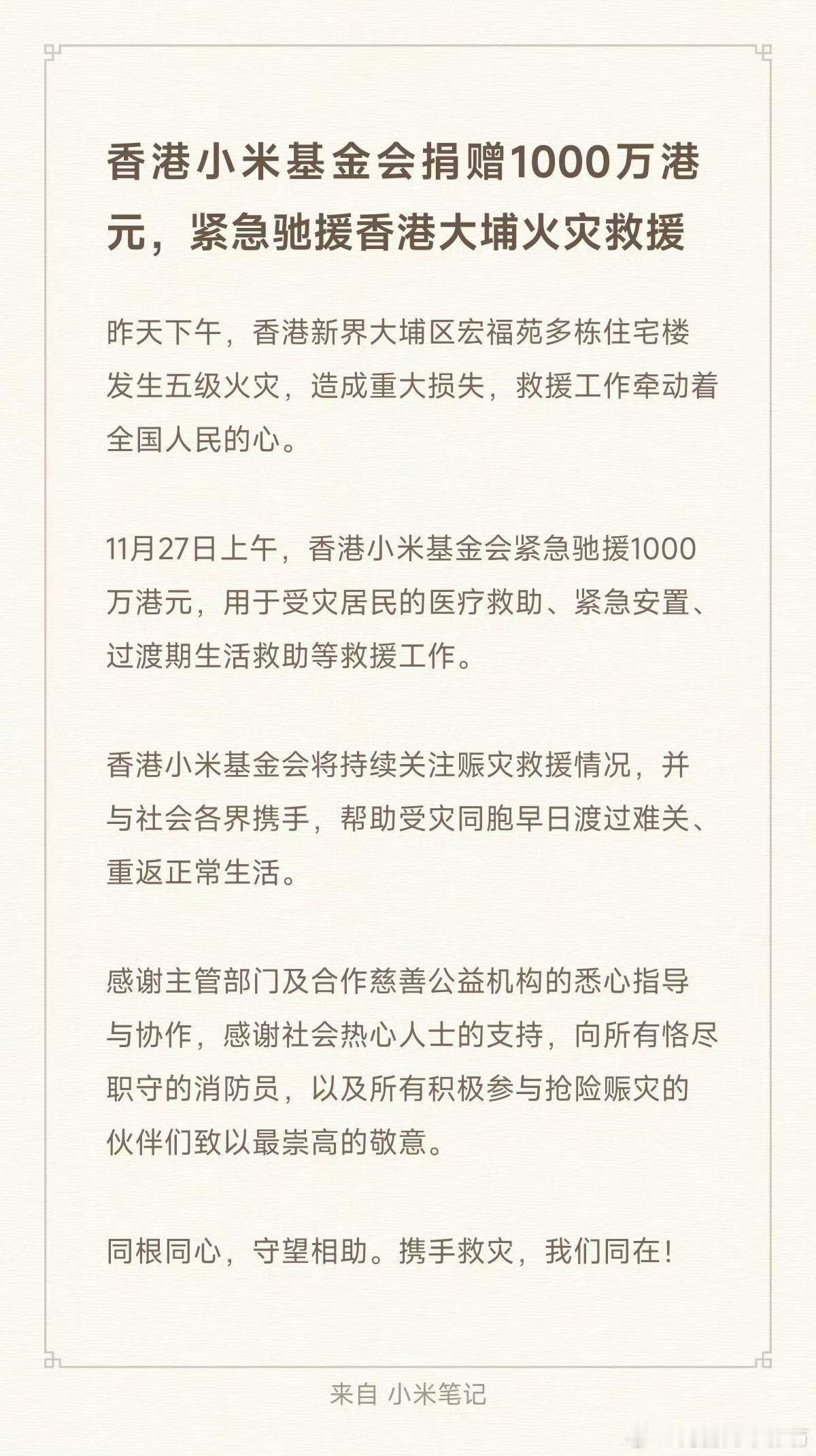 许多企业自发捐款驰援香港大埔火灾救援比亚迪(香港)捐赠1000万港元香港小米基金会捐赠1000万港元小鹏汽车捐赠500万港元同根同心!大v聊车香港火灾已致44人遇难