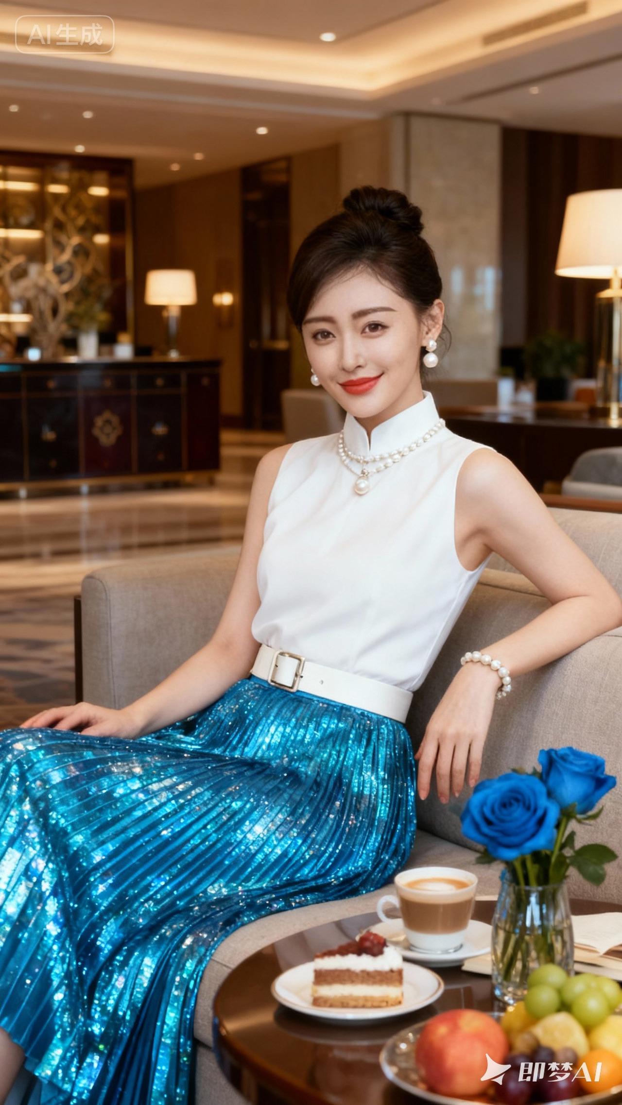 优雅下午茶时光,蓝裙白衣,尽显时尚魅力