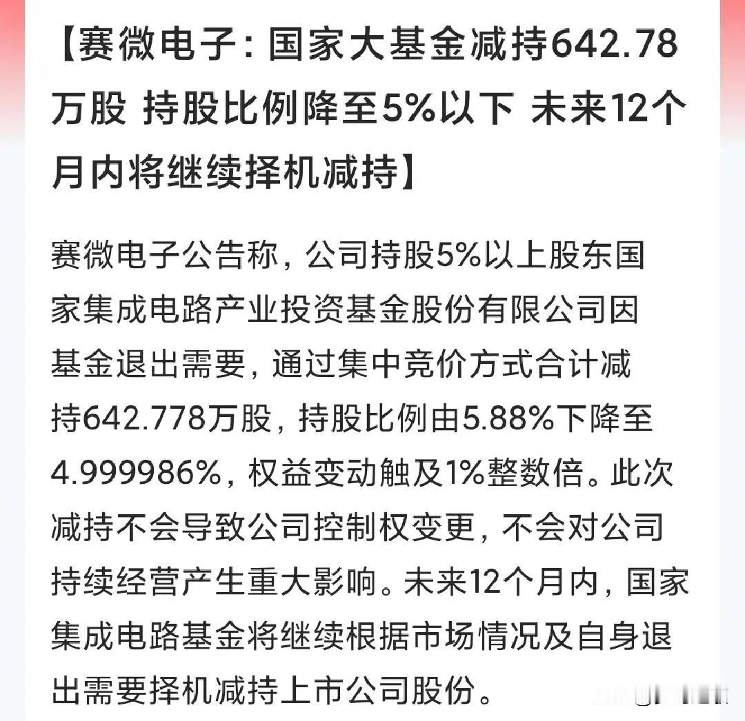 半导体迎来重大利空消息,老高之后的减持又来了 赛微电子发公告国家大基金减持公司股份,减持完成后国家大基金持股低于5%。 也就是说以后如果在减持公司股份,就不用再发减持公告了,这是一个很大的利空消息。 赛微电子从23元启动,目前拉到了50元,今天还差点20cm封涨停,完全就是牛股的走势,市盈率只有23.38,根本不高,但大基金减持给了一记重锤,明天将会出现很大的波动,至少在股民的心中没有了信心。 本来最近科技股就涨不起来,这个消息来了很可能把半导体板块带下去,希望市场不要用脚投票。