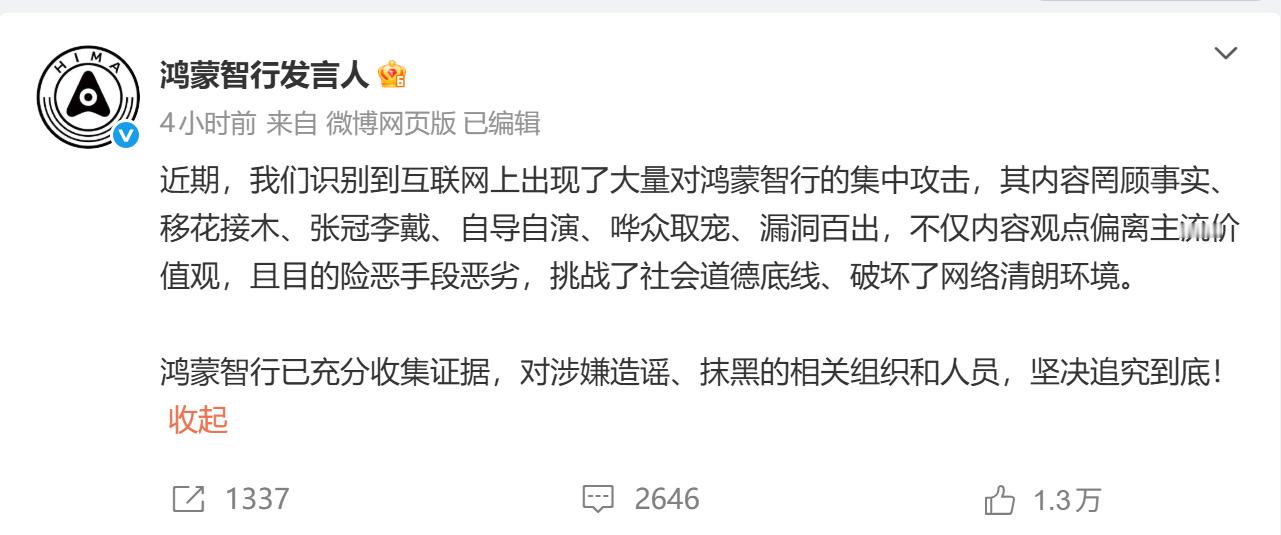 鸿蒙智行称已充分收集证据 鸿蒙智行发言人称:近期,我们识别到互联网上出现了大量对鸿蒙智行的集中攻击,其内容罔顾事实、移花接木、张冠李戴、自导自演、哗众取宠、漏洞百出,不仅内容观点偏离主流价值观,且目的险恶手段恶劣,挑战了社会道德底线、破坏了网络清朗环境。鸿蒙智行已充分收集证据,对涉嫌造谣、抹黑的相关组织和人员,坚决追究到底!