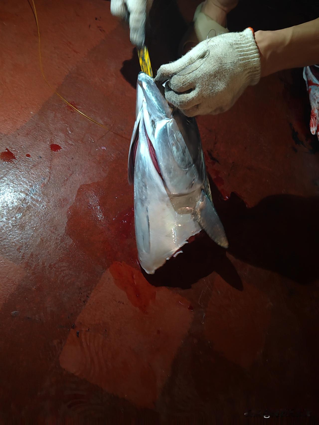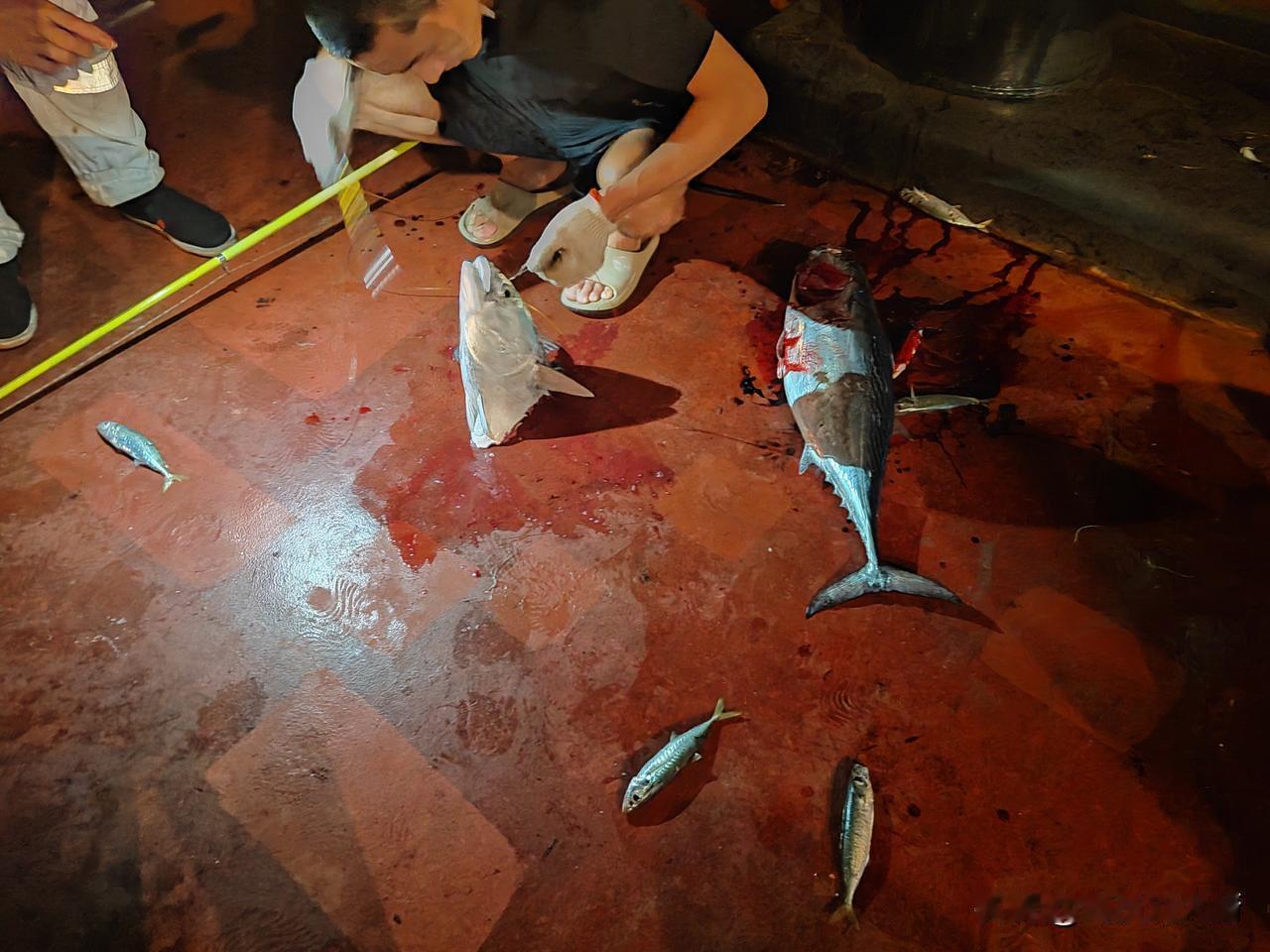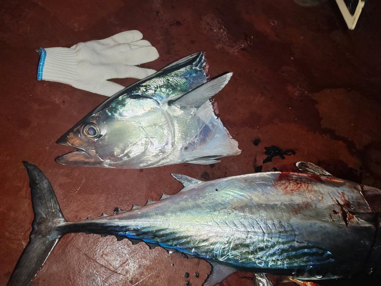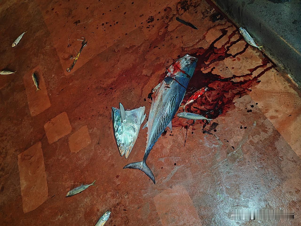晚上10点半了,到外面去看看今晚的收获咋样?多的话帮忙给提到库房里,刚刚走到船尾,一个哥们钓上来了一个鱼头,我说,**,您太厉害了,钓上来了一个大鱼头啊! 这哥们说,刚开始看着这条鱼挺大,怎么越拉越轻啊?原来是刚要拉出水面时,被一条大鲨鱼一口吃掉了一大半,这条大鲨鱼足足有100多斤重,别看只剩下一个鱼头了,刚钓上来时,还是活的,因为鱼钩卡在了鱼的嘴里了,在取鱼钩的时候,这个鱼头还要咬人呢,太可怕了!