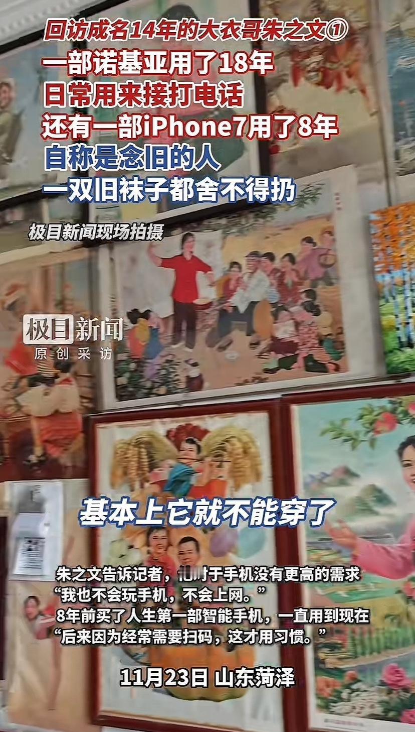 大衣哥接受采访,他不会上网不会聊天,是一个怀旧的人,一部老年机用了18年,一部苹果7用了8年,袜子破的不能用,也舍不得扔外面,要留家里。 大衣哥其实清楚的很,学智能机对他来说不算难,名人低调点好,也像大众天天拍视频,容易引来麻烦,现在这样挺好!