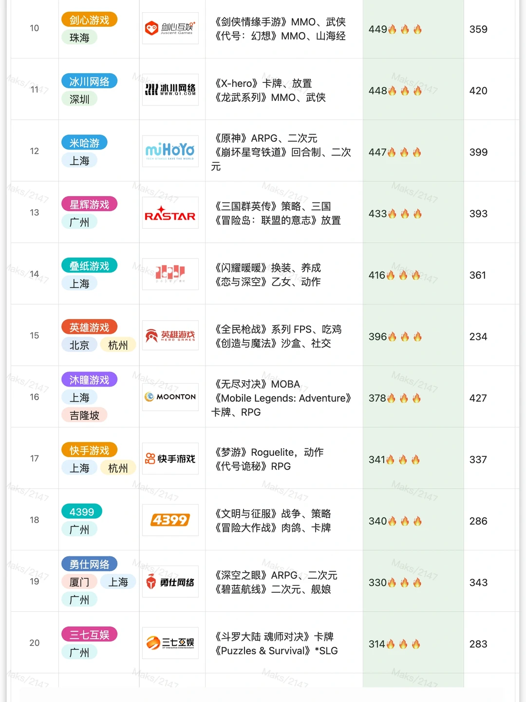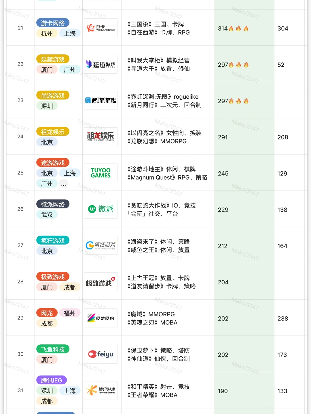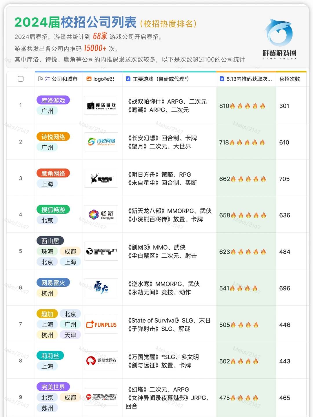 3. 春招期间,游鲨送出了40+游戏公司的内推码,共计15000多次(通过整理后台收到的公司关键词数量统计)。次数最多的是库洛、诗悦、鹰角、畅游、西山居、网易(雷火)、趣加、莉莉丝等公司,次数超过100的公司有39家: