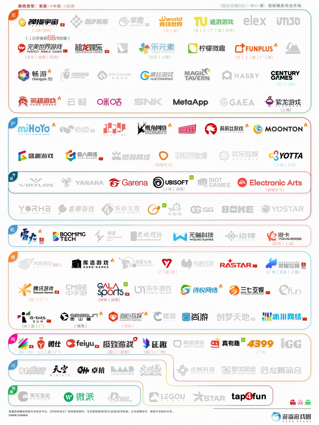 2. 春招岗位较全(包含:策划\技术\美术\运营\发行\测试\PM\职能大类)的公司有米哈游、畅游、趣加、吉比特雷霆、沐瞳等5家;开启策划、美术、技术三大类岗位招聘的公司有51家,整体较秋招有所减少。