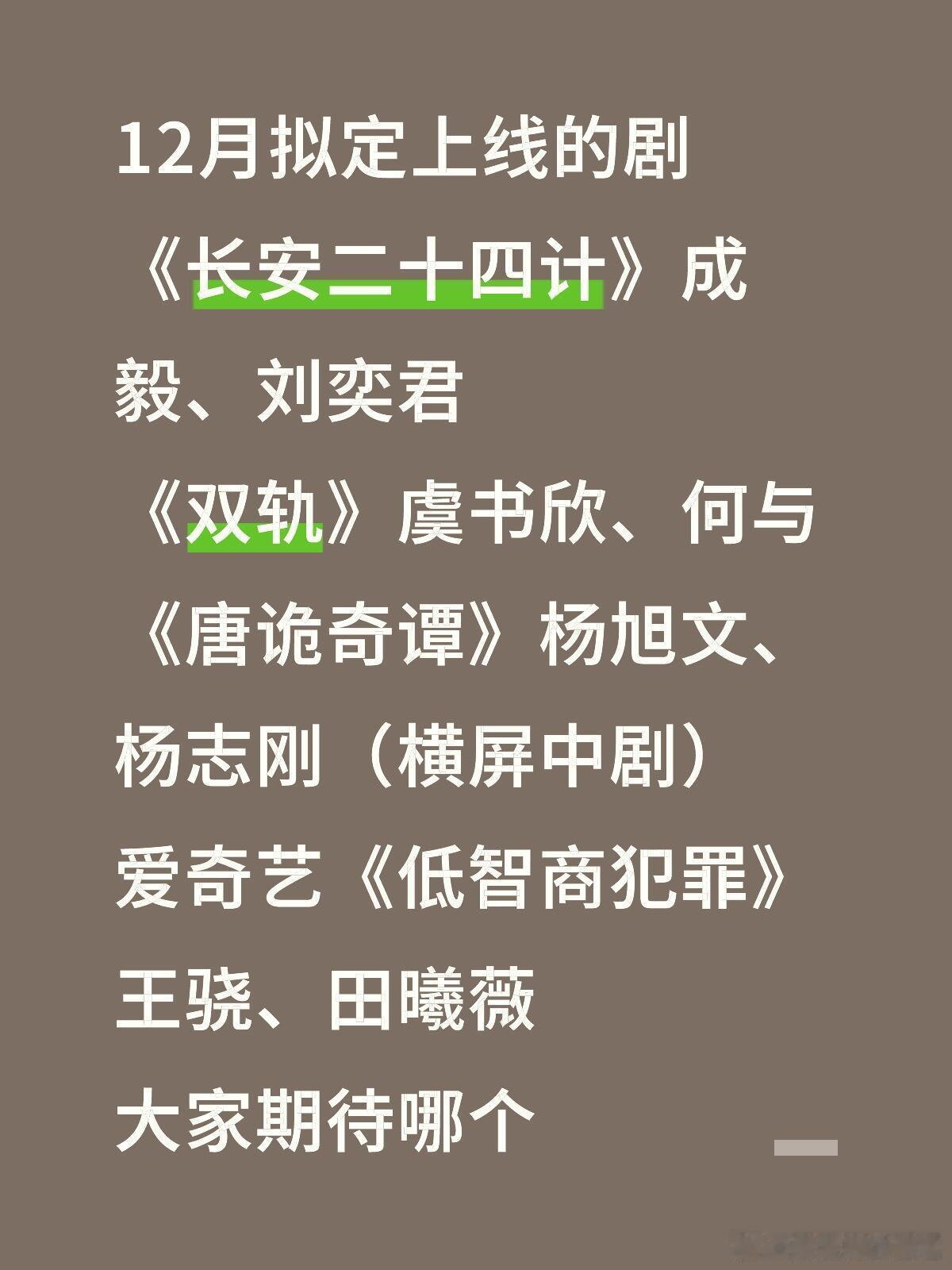 12月拟定上线的剧《长安二十四计》成毅、刘奕君《双轨》虞书欣、何与《唐诡奇谭》杨旭文、杨志刚(横屏中剧)爱奇艺《低智商犯罪》王骁、田曦薇大家期待哪个