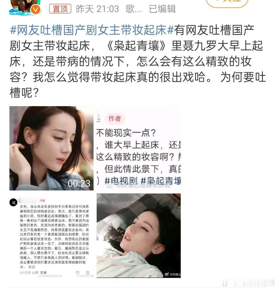 网友吐槽国产剧女主带妆起床热巴新剧又被吐槽了,也没有很浓的妆吧,对美女太苛刻了