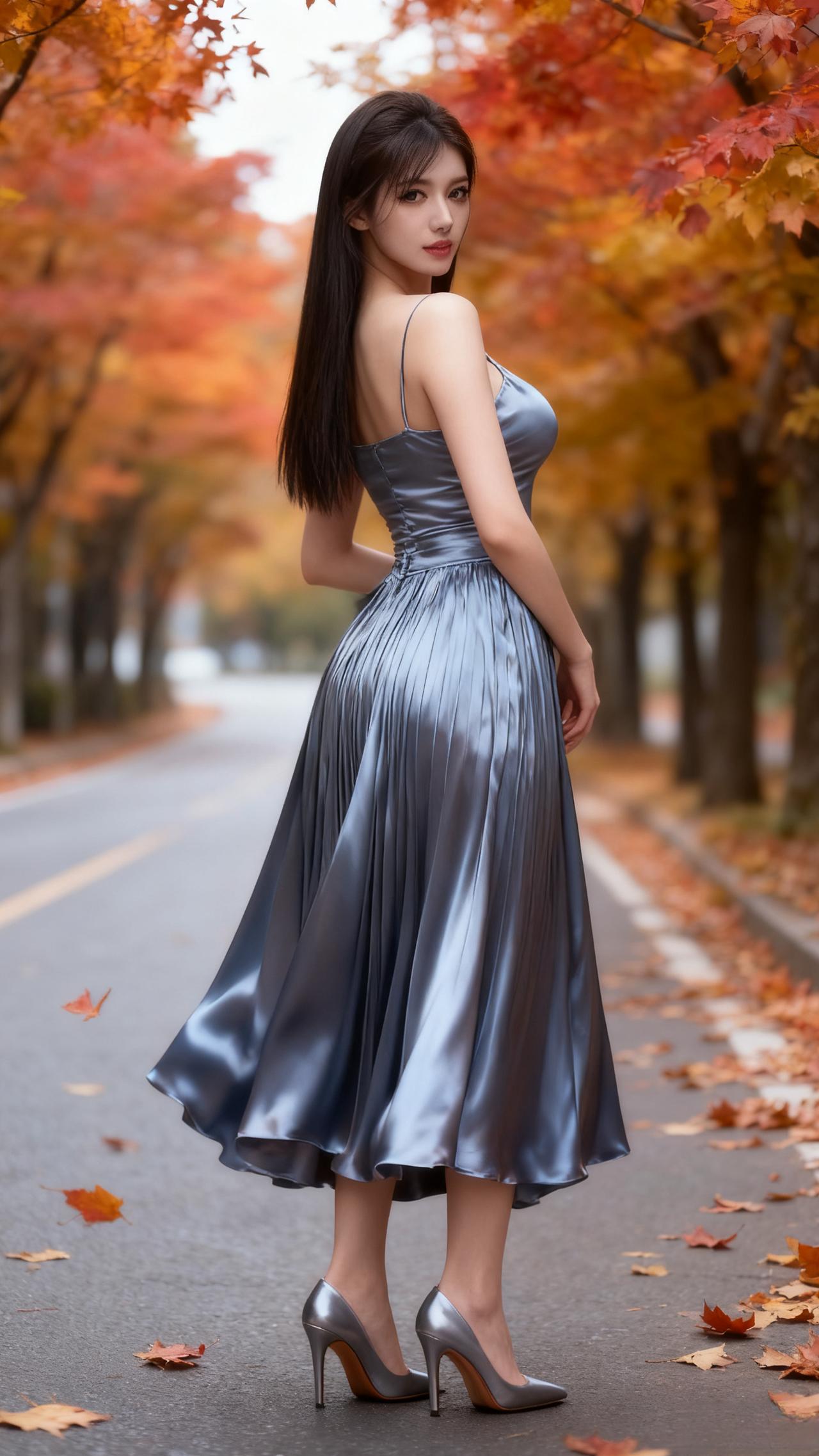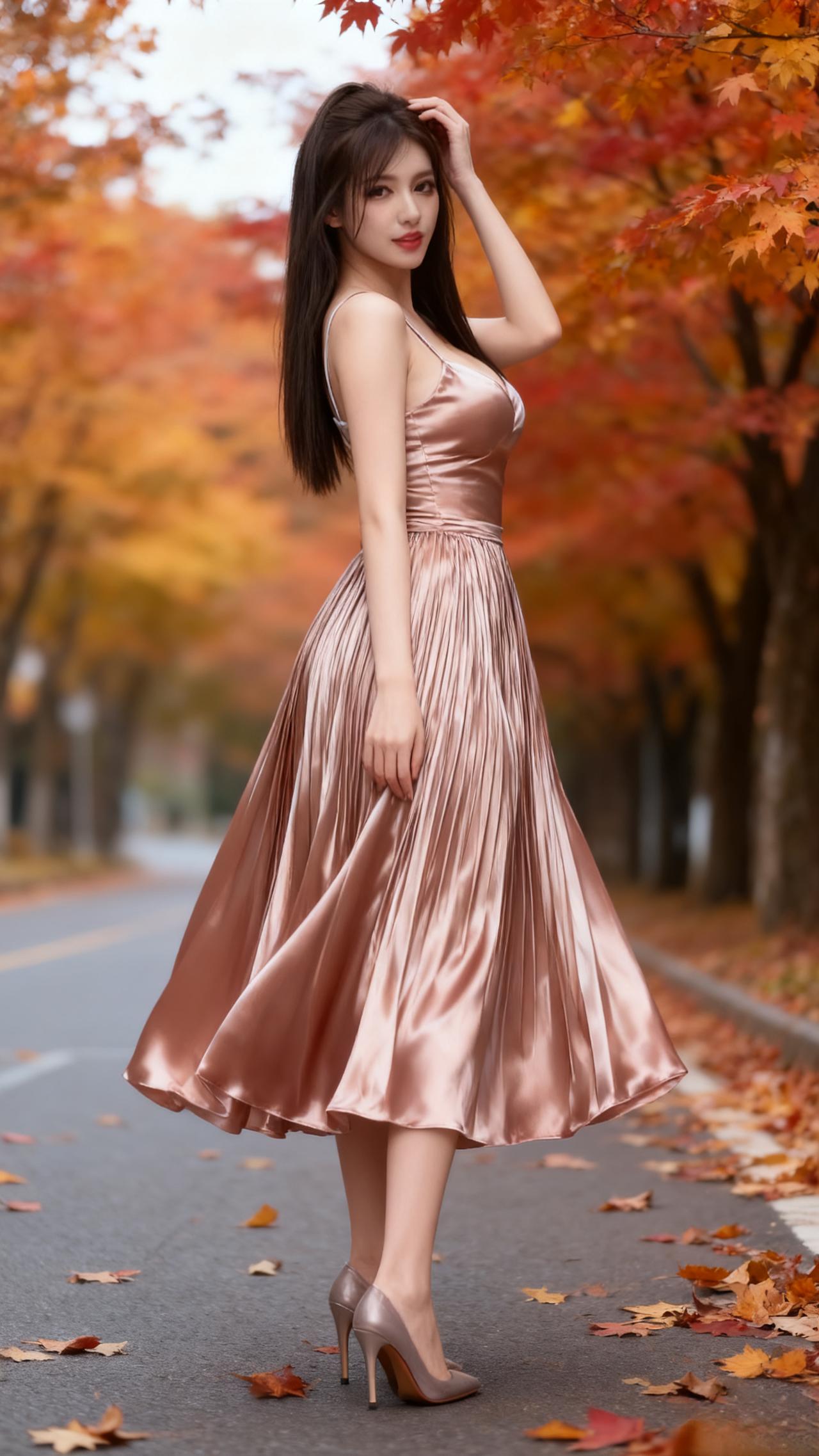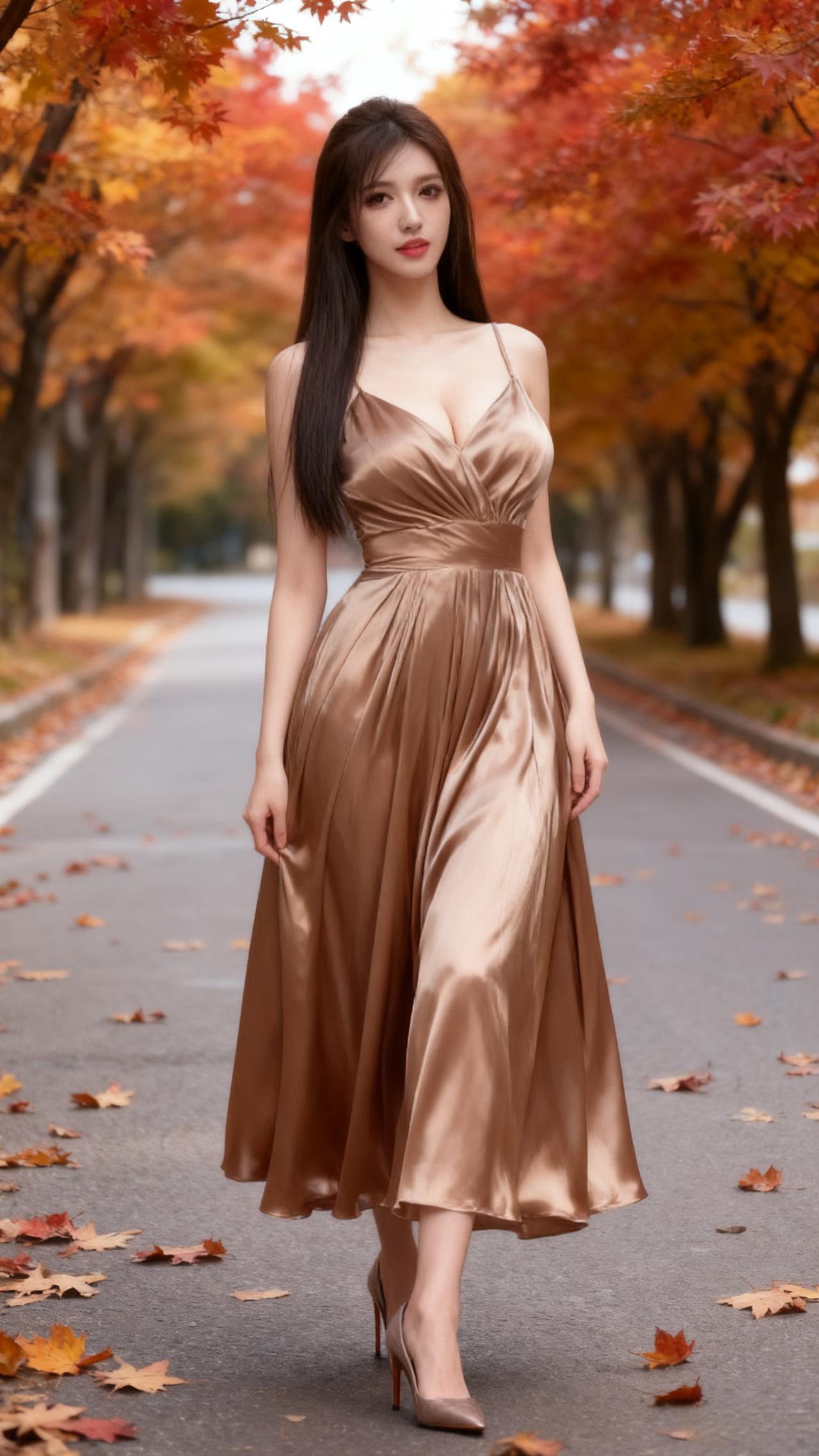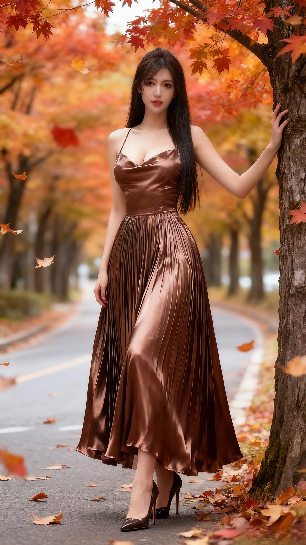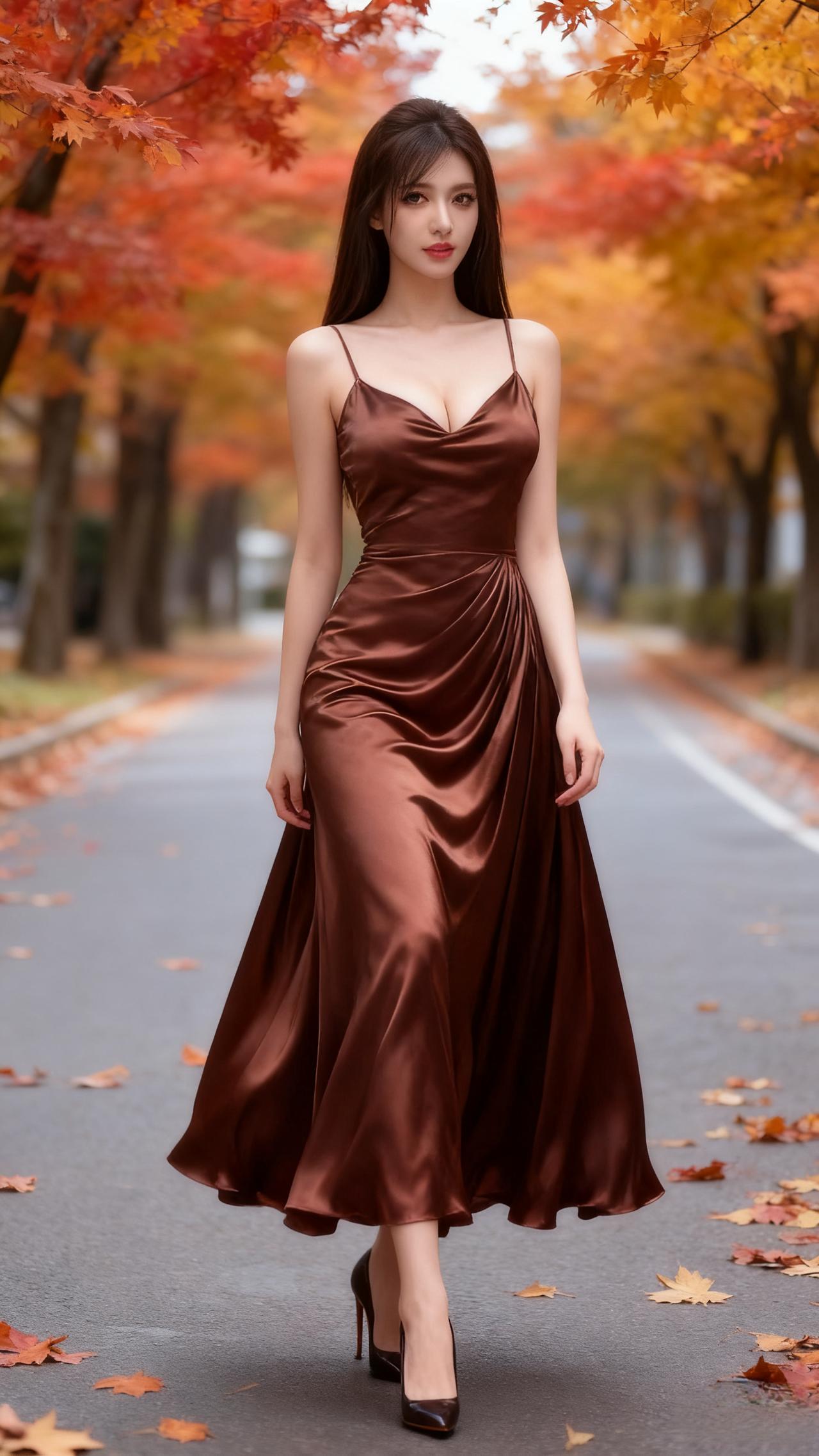 秋意浸染的林荫道上,缎面香槟色吊带裙衬出她的优雅身姿,褶皱裙摆随步履轻晃,与落枫的暖调相映成画。长发垂肩,红唇轻缀,黑高跟鞋叩响路面,将秋日的慵懒与明艳揉作一帧生动风景,每一处细节都晕染着温柔又舒展的氛围感。