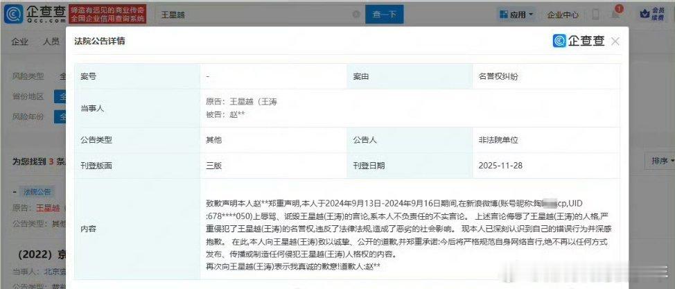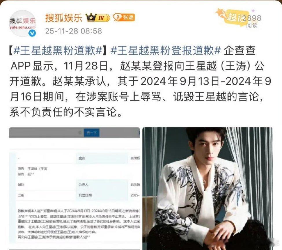 王星越黑粉登报道歉恭喜王星越告黑成功,黑粉为其造谣、辱骂的不实言论登报道歉。互联网不是法外之地,支持王星越合理维权。 王星越黑粉登报道歉