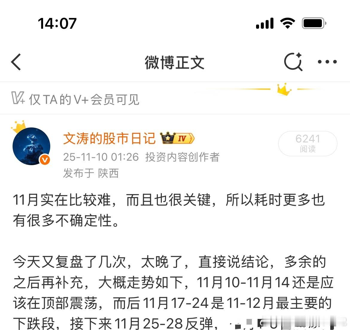 10月底时给大家判断11月是带上影的阴线,中小阴,3个点左右,目前月线跌了2%,预测基本再次达成。图1 图3股市月线预测对了7个月,不容易的,尤其是9-11月的调整,很难预测。还有V+发的11月14日的顶部以及11月17-24的下跌,看起来很简单,但没有其他人能做到这样的预测。图2今天给大家下个月的月线预测,带下影线的阳线,阳线也是中小阳,还是3个点左右。每个月互动榜前10的朋友,我会把下月走势发给你,多互动我给了大家具确定性的预测,大家多给我点赞哈,不知道什么时候能到每篇1000赞,也体验一把大V的感觉。连续对的越久,错的概率越大,不过12月应该不会错。a股