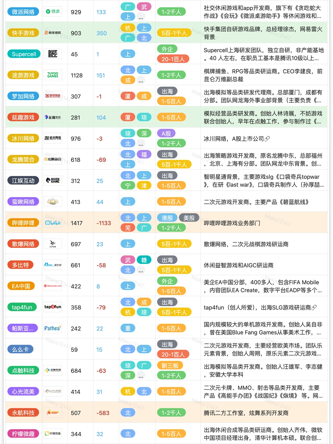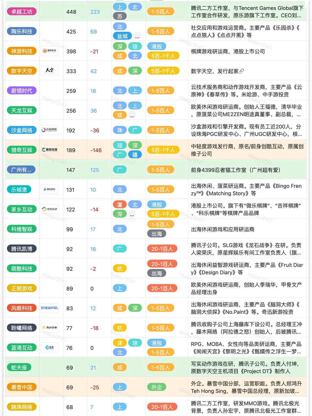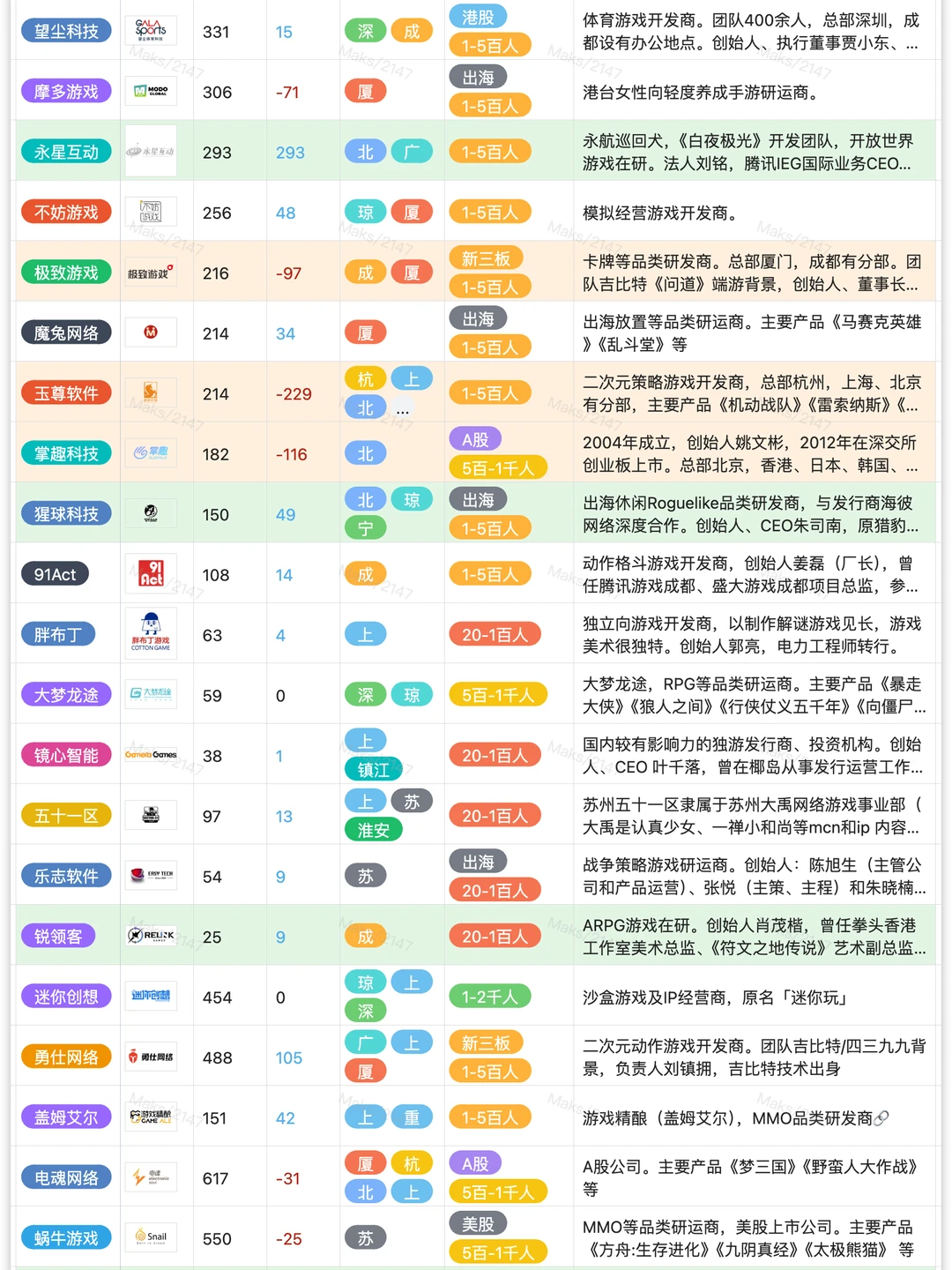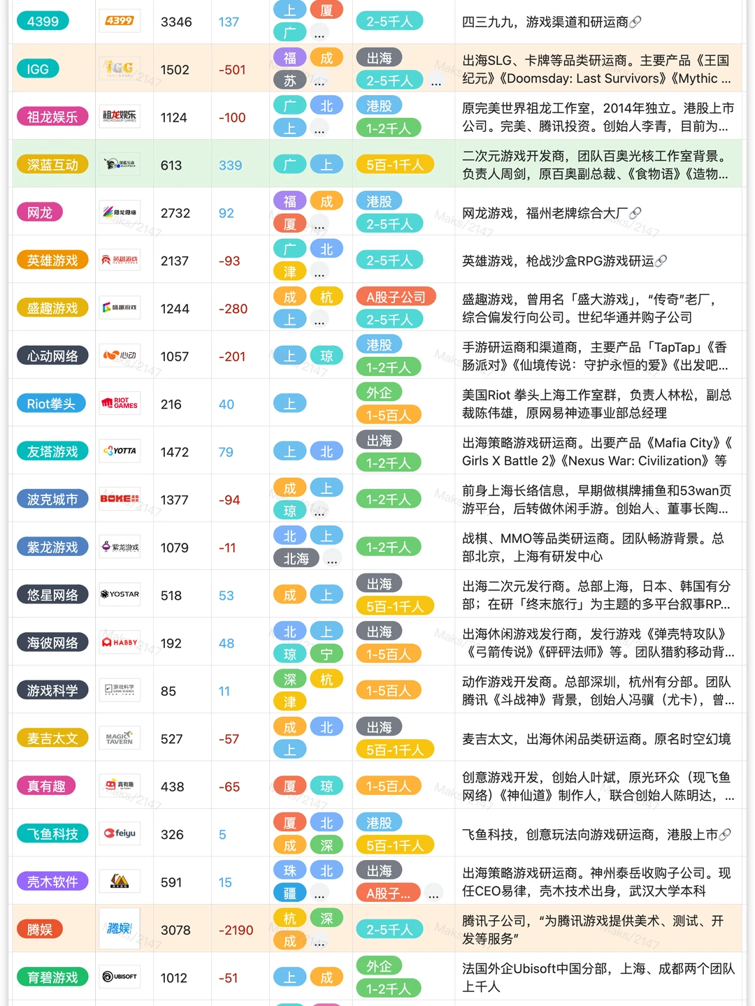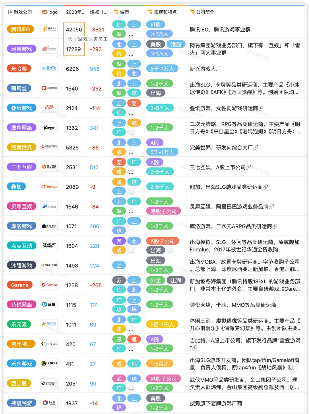 进入年中,各家公司已陆续填报2023年年报,游鲨统计了各公司2022年和2023年社保人数变动情况,供大家求职参考。(数据来源:游鲨游戏行业资料共享文档) 本期绝大多数游戏公司社保人数已公示和统计,可以较为全面地反应各公司人数增减情况。本期笔记也将是人数增减统计系列最后一期。后面将按照游戏类型、地区等推出新系列笔记,欢迎关注~ (本笔记公司人数,是指已公示2023年年报的主体的社保人数,非公司全部人数;2023年社保人数是指2023年末公司社保人数)