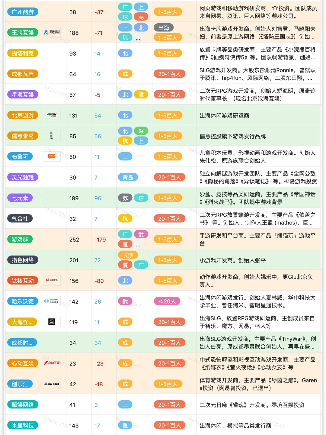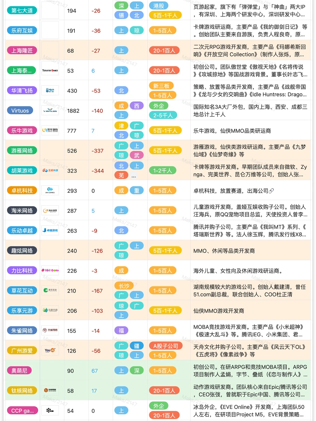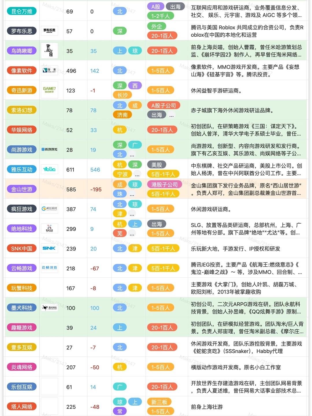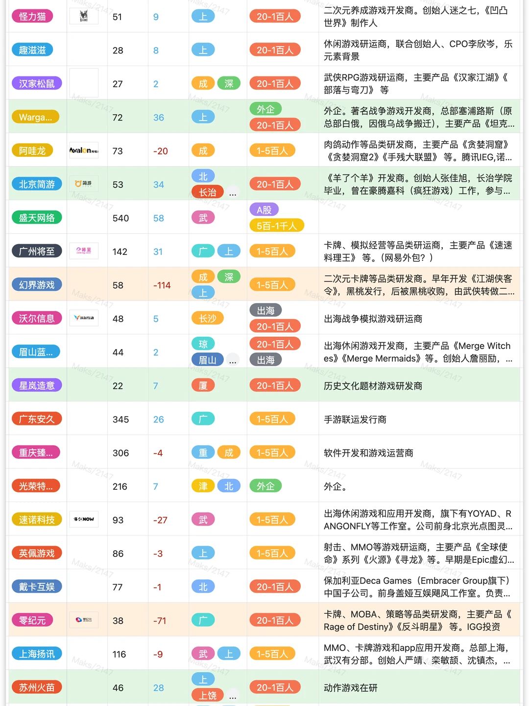 进入年中,各家公司已陆续填报2023年年报,游鲨统计了各公司2022年和2023年社保人数变动情况,供大家求职参考。(数据来源:游鲨游戏行业资料共享文档) 本期绝大多数游戏公司社保人数已公示和统计,可以较为全面地反应各公司人数增减情况。本期笔记也将是人数增减统计系列最后一期。后面将按照游戏类型、地区等推出新系列笔记,欢迎关注~ (本笔记公司人数,是指已公示2023年年报的主体的社保人数,非公司全部人数;2023年社保人数是指2023年末公司社保人数)