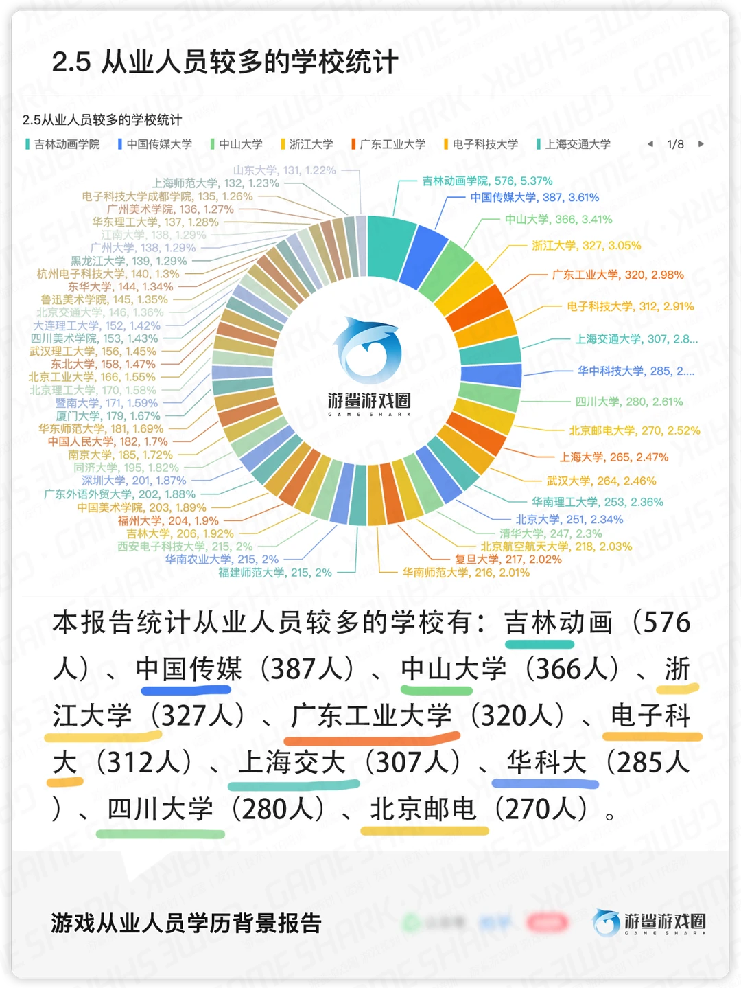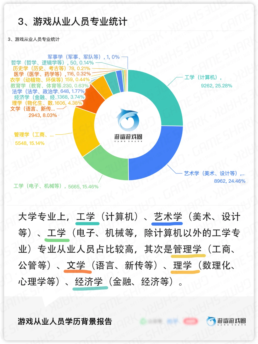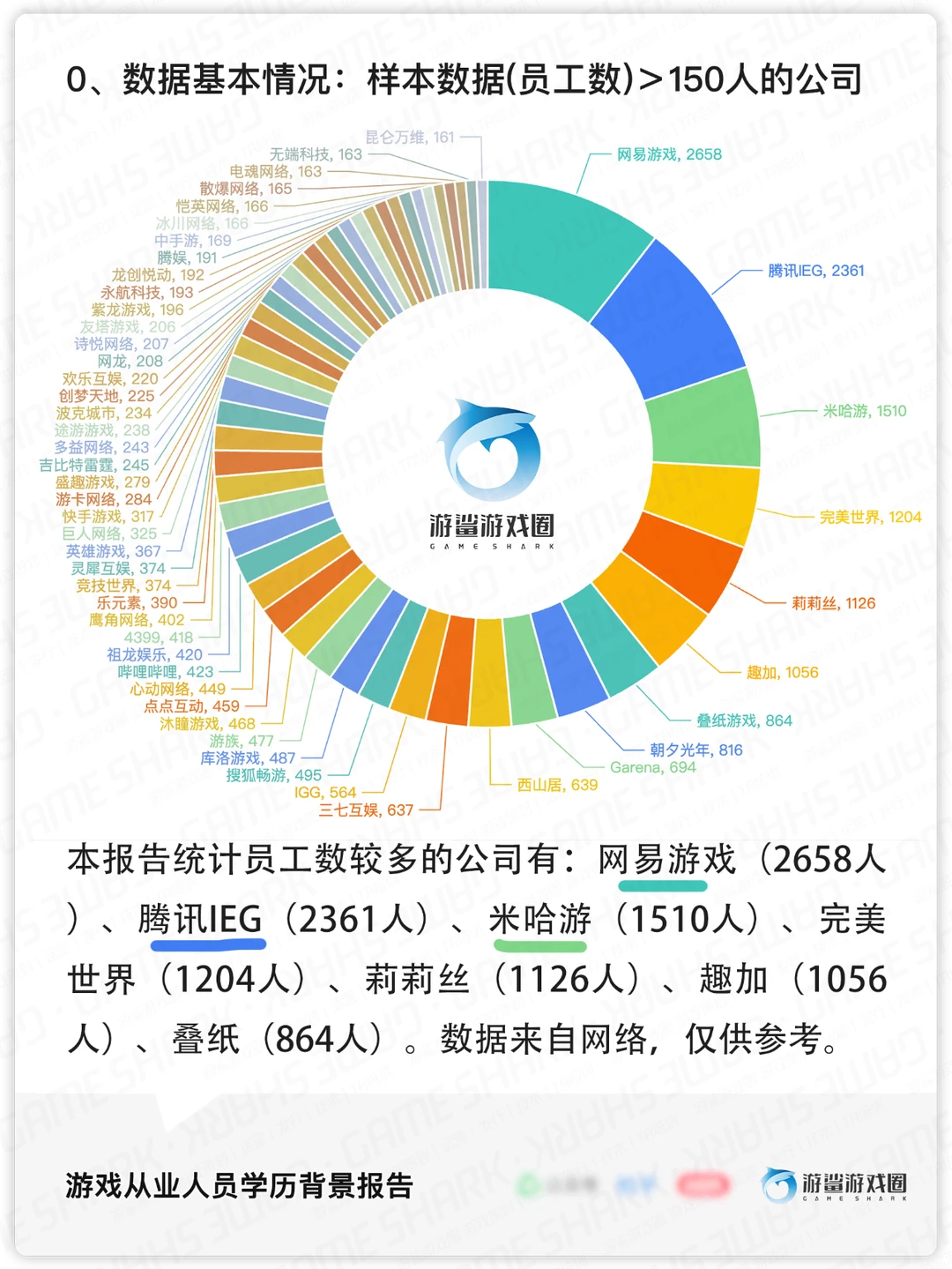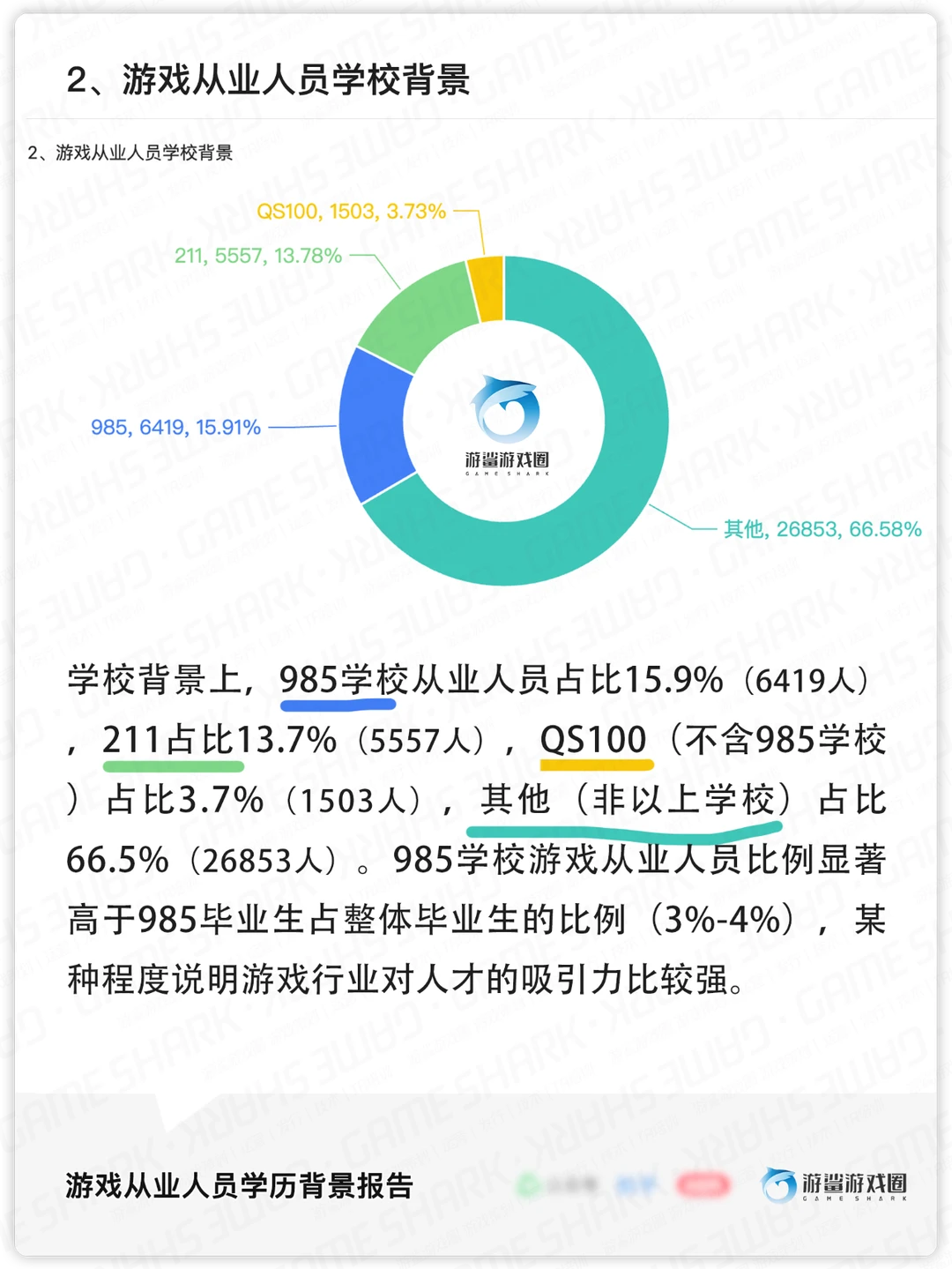 本次游鲨共统计了全国各地,近4万名游戏从业人员背景数据,对行业人员学历、学校、专业、年龄、跳槽频率进行了统计,基本情况如下: