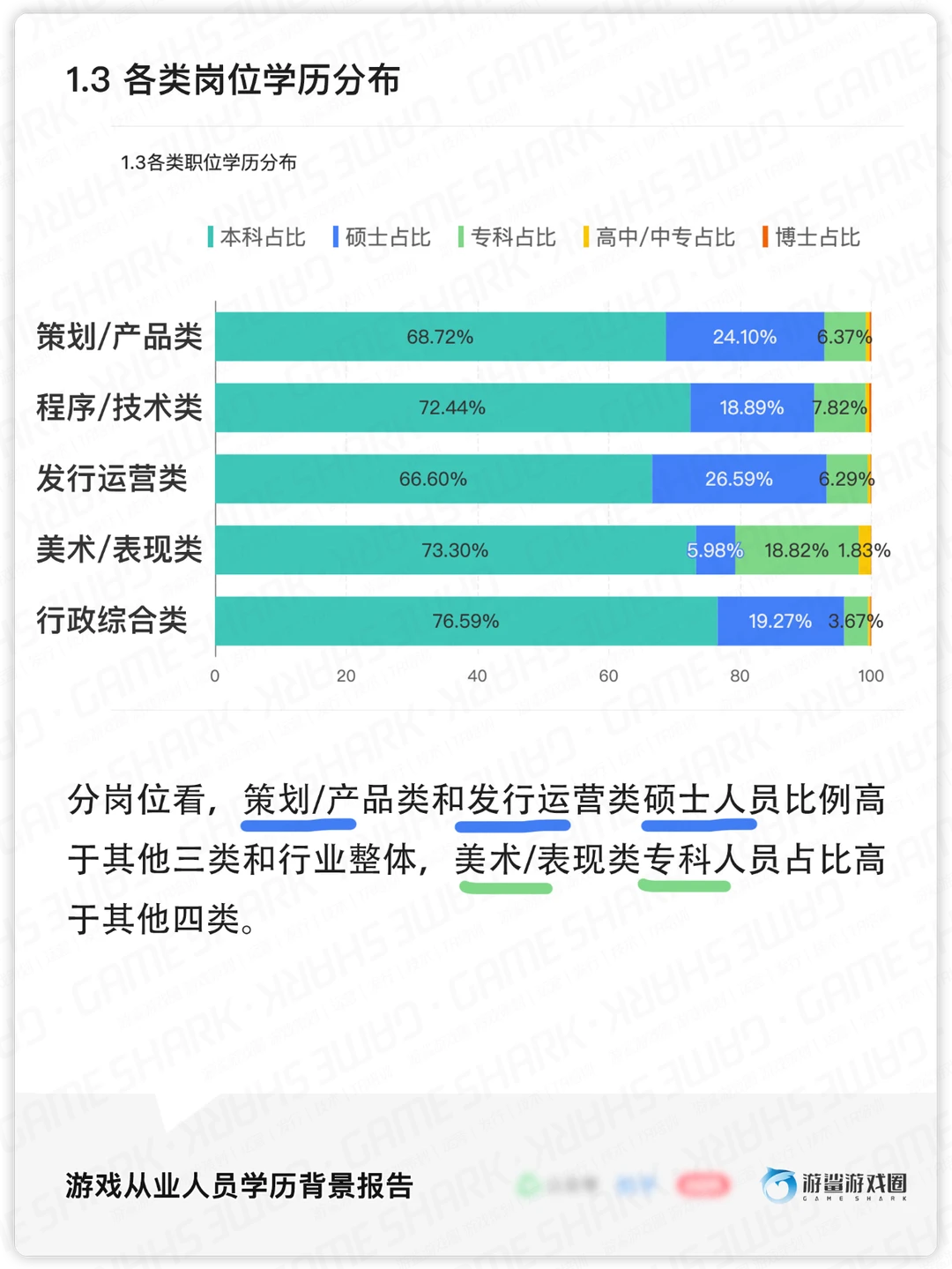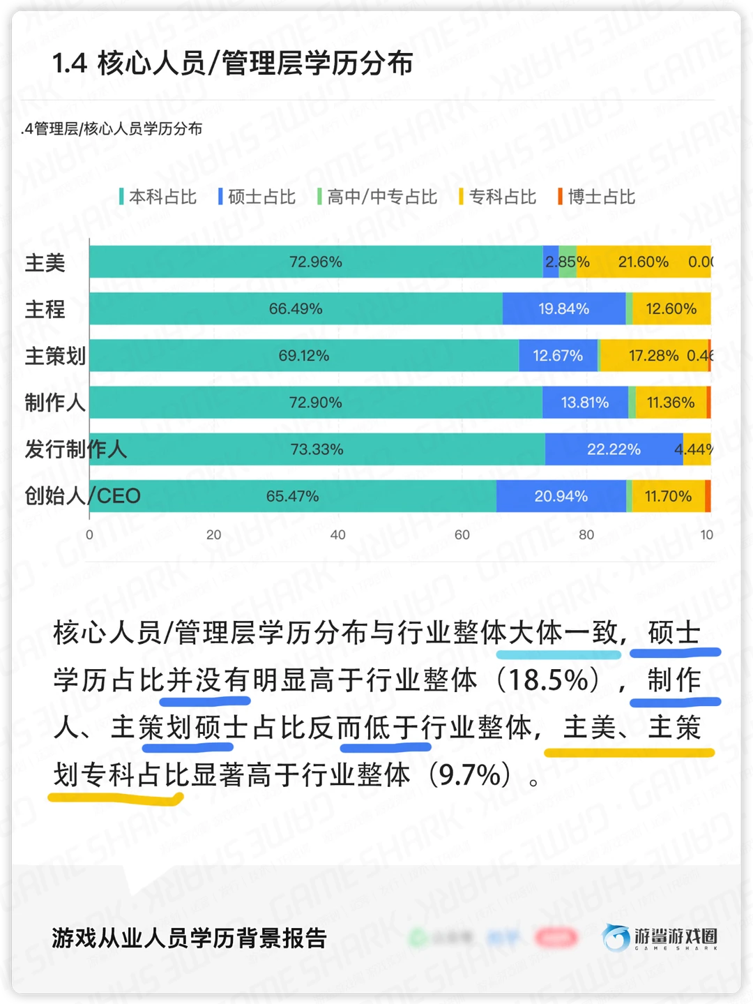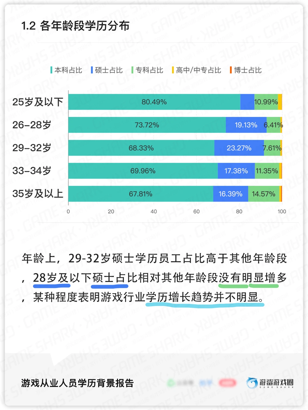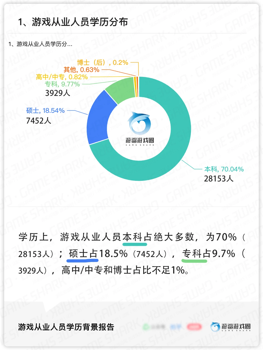 [种草R]学历上,游戏从业人员本科占绝大多数,为70%(28153人);硕士占18.5%(7452人),专科占9.7%(3929人),高中/中专和博士占比不足1%。