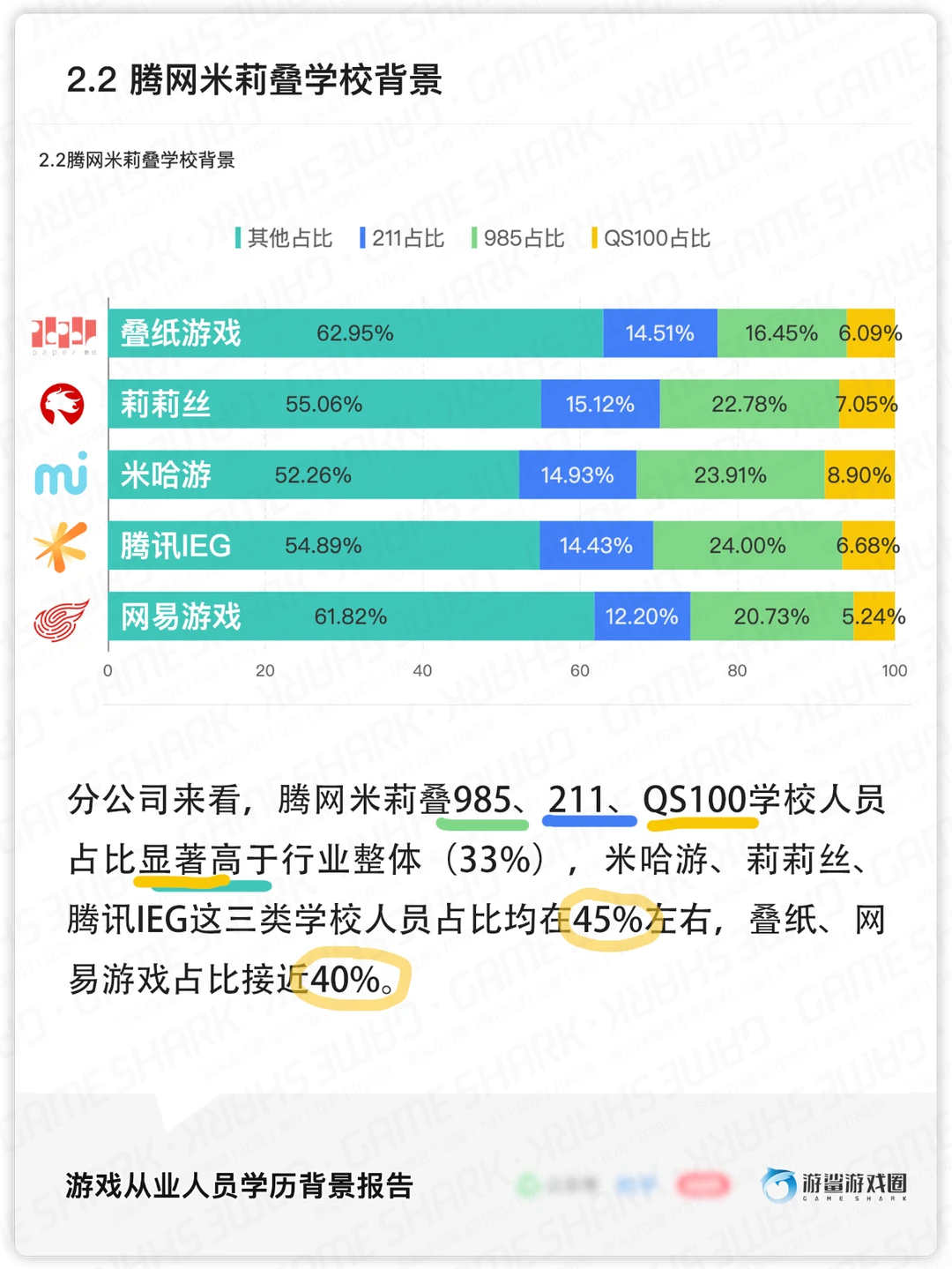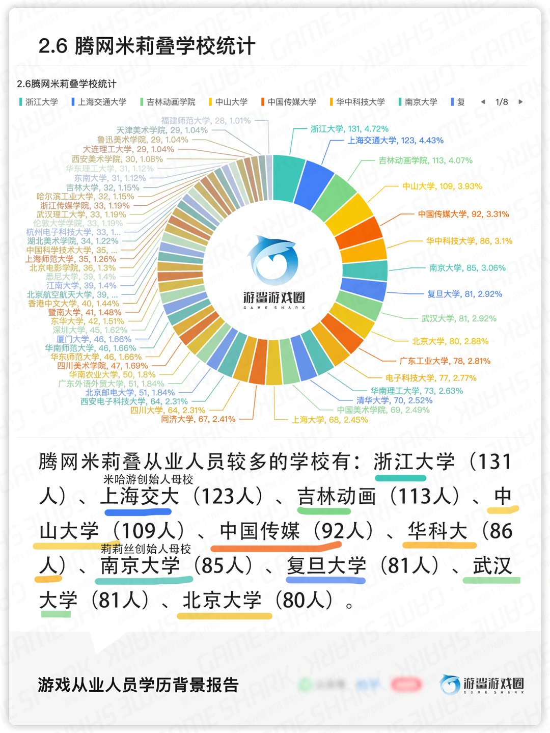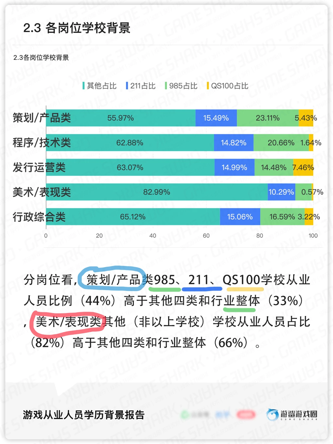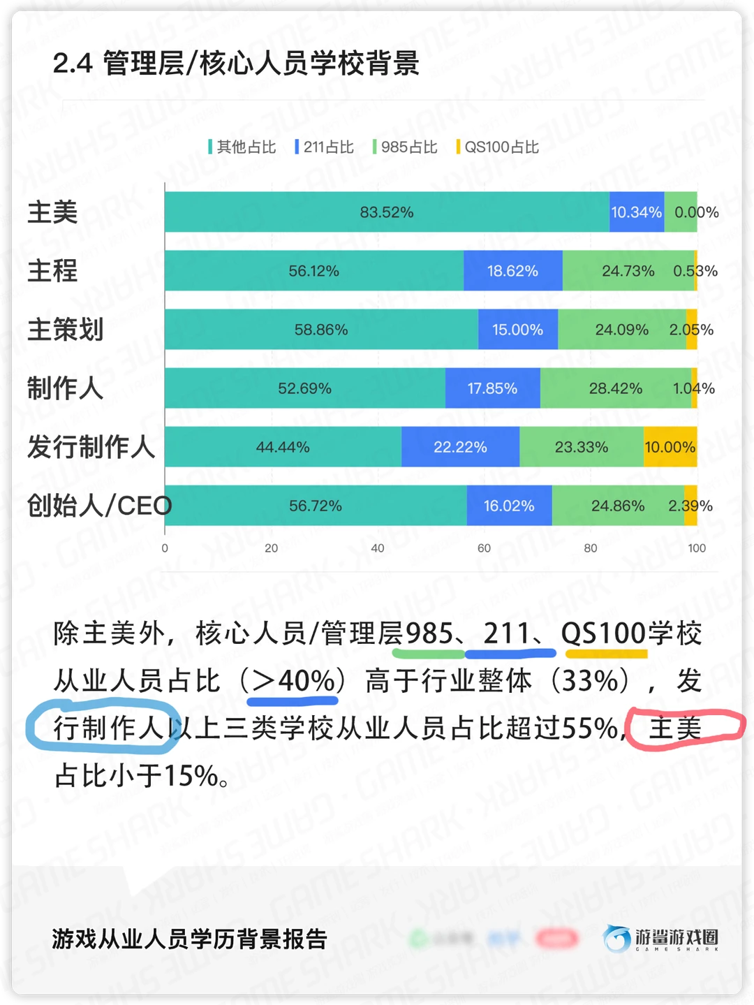 学校背景上,985学校从业人员占比15.9%(6419人),211占比13.7%(5557人),Q5100(不含985学校) 占比3.7%(1503人),其他(非以上学校)占比66.5%(26853人)。985学校游戏从业人员比例,显著高于985毕业生占整体毕业生的比例(3%-4%)。