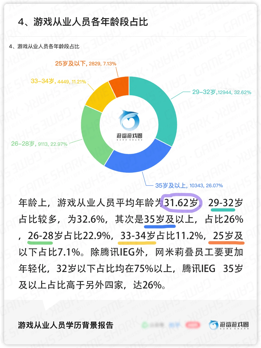 [彩虹R]年龄上,游戏从业人员平均年龄为31.62岁,29-32岁占比较多,为32.6%,其次是35岁及以上,占比26%,26-28岁占比22.9%,33-34岁占比11.2%,25岁及以下占比7.1%。除腾讯IEG外,网米莉叠员工要更加年轻化,32岁以下占比均在75%以上,腾讯IEG 35岁及以上占比高于另外四家,达26%。