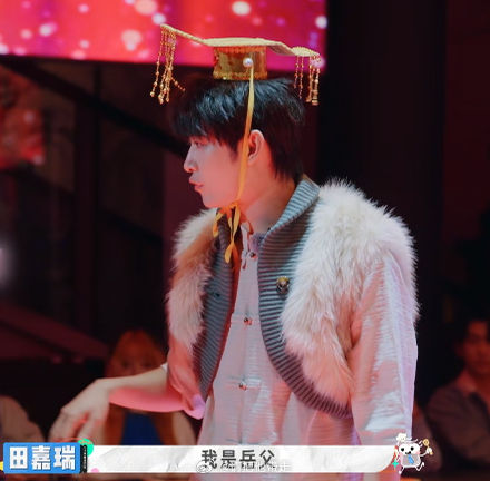 田嘉瑞见岳父穿得像个岳父 马上要上门见岳父的男生,千万不要看这段,不然容易出事故节目组让田嘉瑞和颜人中都在“女婿上门见老丈人”的情景里演女婿,结果田嘉瑞会错意,给自己打扮成了玉皇大帝版老丈人,头上戴着玉皇大帝那个有帘子的冠,身上穿着超短貂马甲,还理直气壮的说自己这是下凡没变成正常人的样呢,给真岳父秦昊都整懵了,简直倒反天罡!怪不得不选田嘉瑞当女婿呢