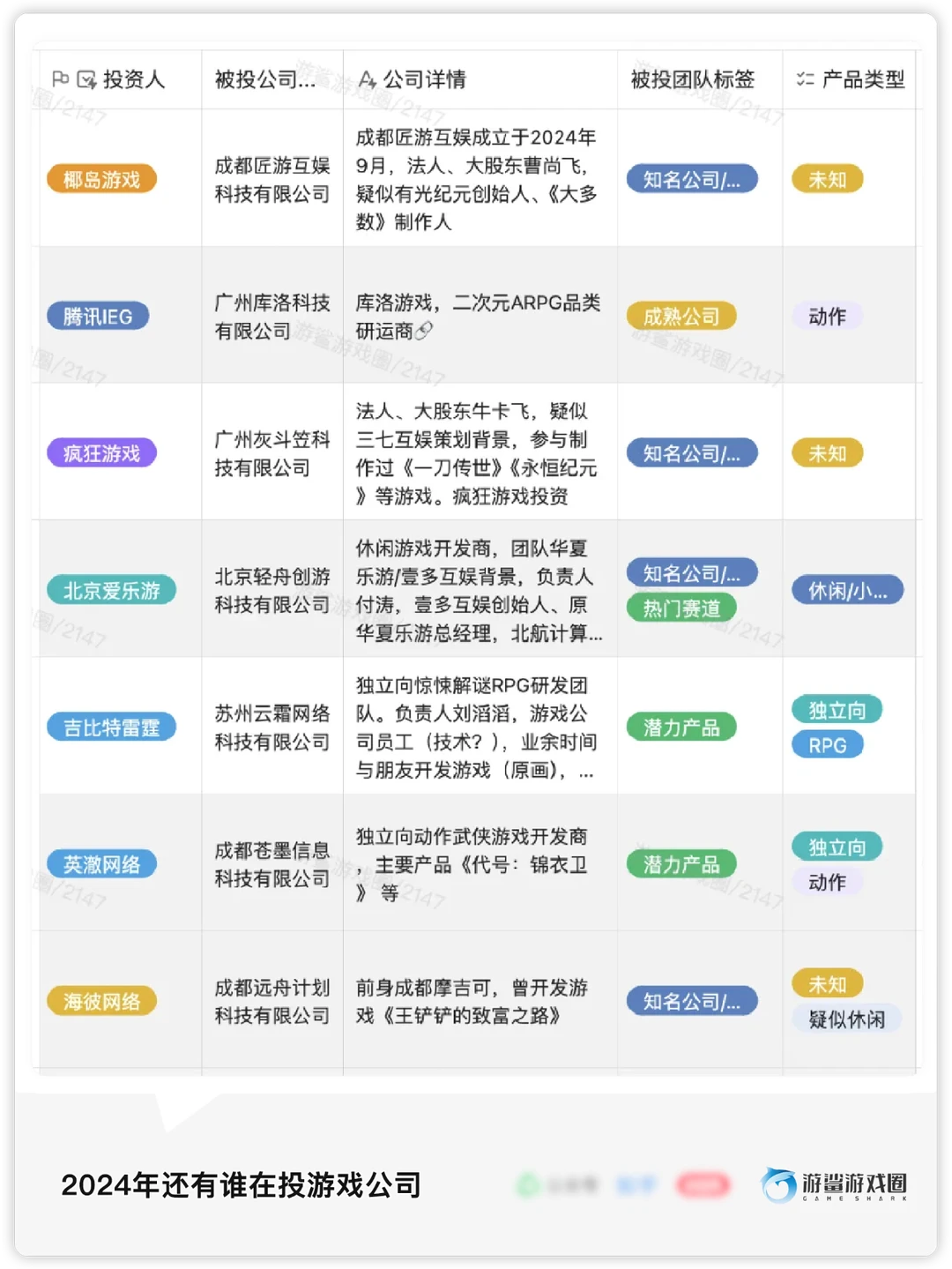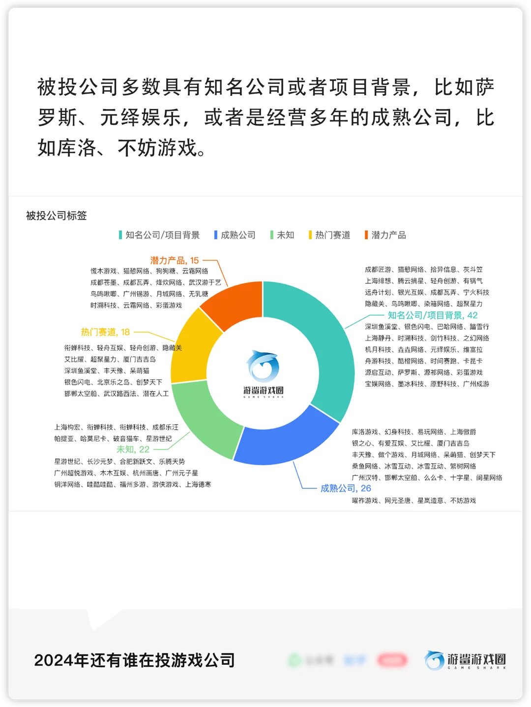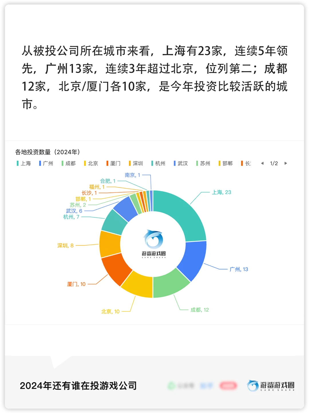 [冲浪板R]2024年共有73家投资方参与了95家公司的投资,其中腾讯、诺惟资本、鹰角等15家公司/机构进行了多次投资,大部分投资方来自游戏行业内。