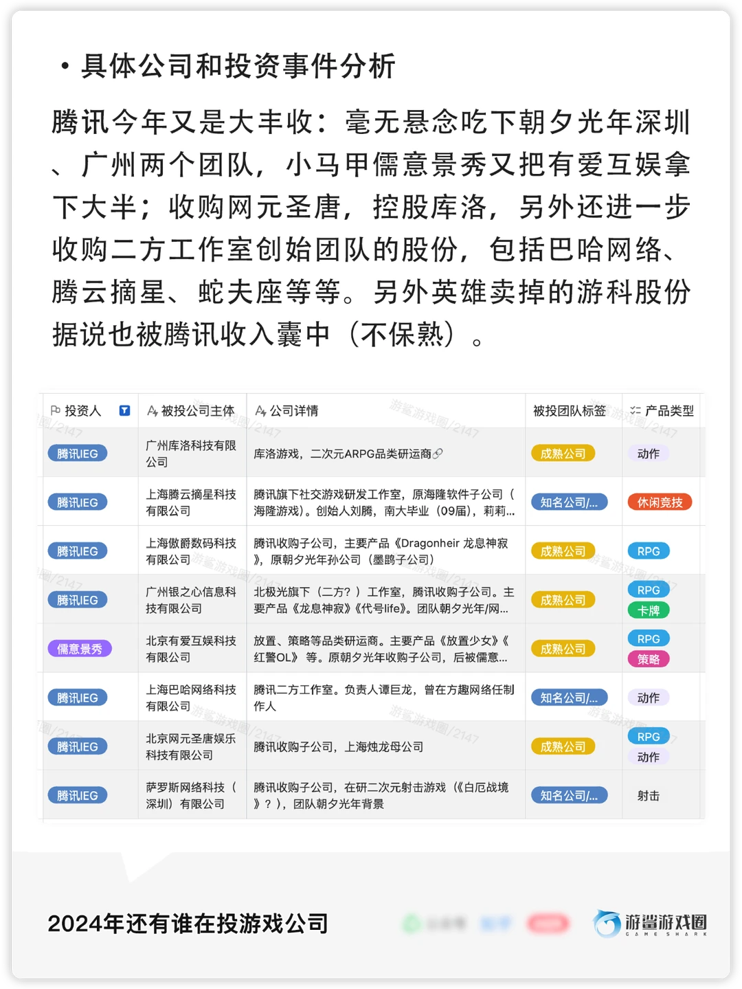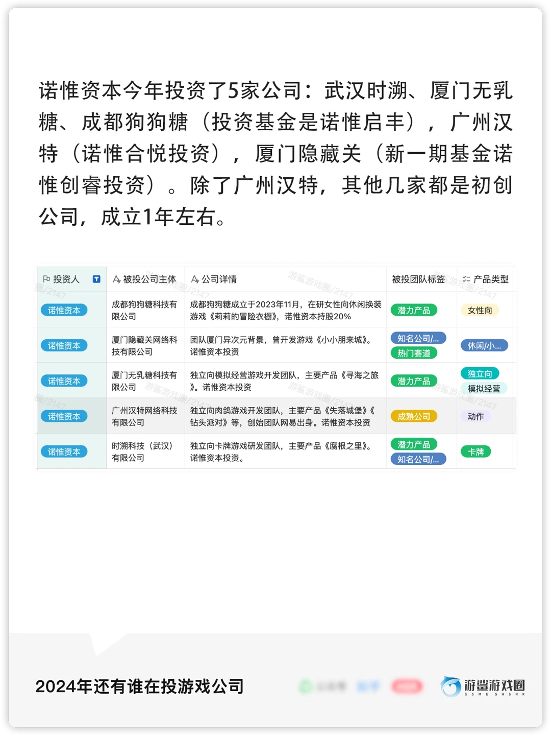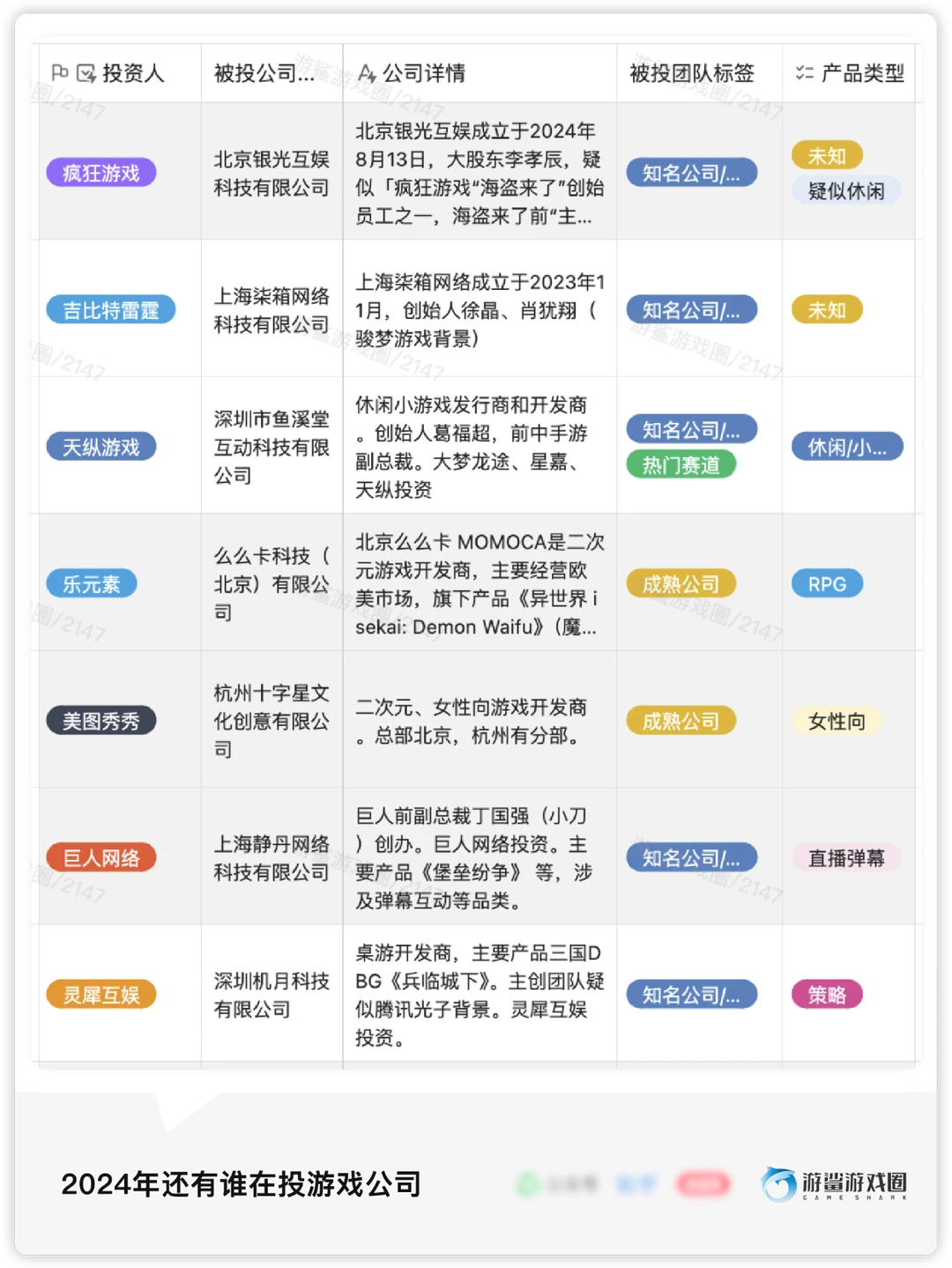[冲浪板R]2024年共有73家投资方参与了95家公司的投资,其中腾讯、诺惟资本、鹰角等15家公司/机构进行了多次投资,大部分投资方来自游戏行业内。