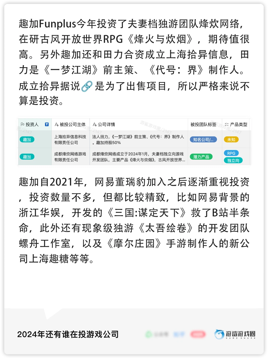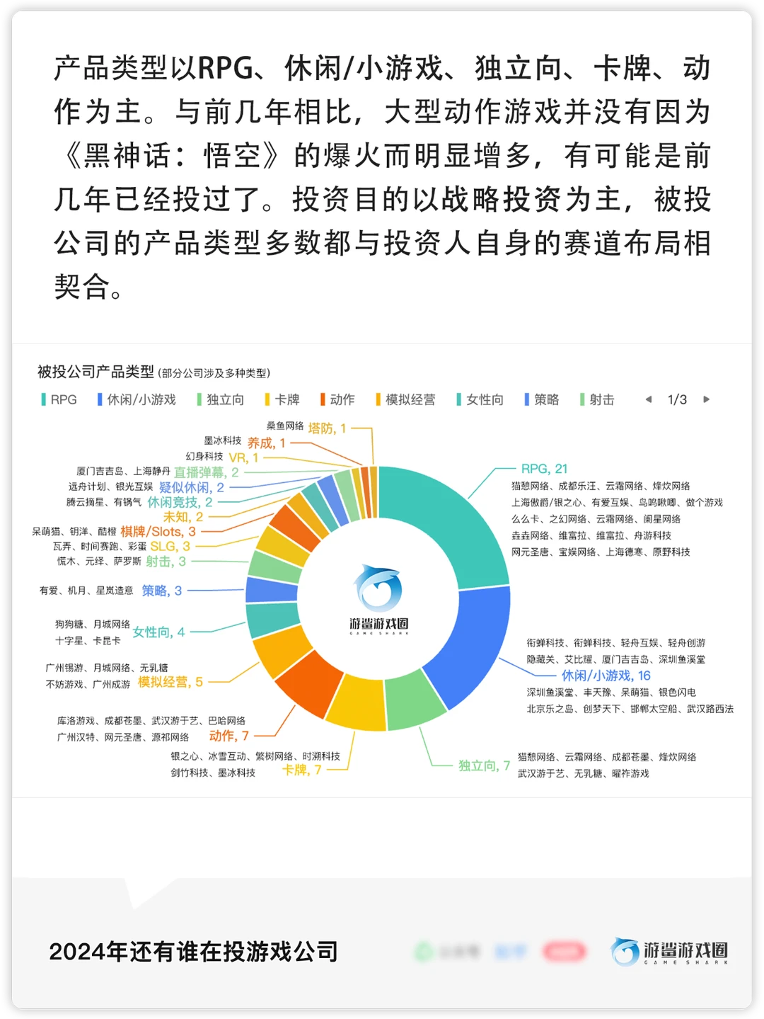 [飞盘R]多数获得投资的公司有知名背景或为成熟的长期运营公司,产品类型集中在RPG、休闲/小游戏、独立游戏、卡牌和动作类游戏,且大多数投资为战略性质,符合投资人自身业务布局。