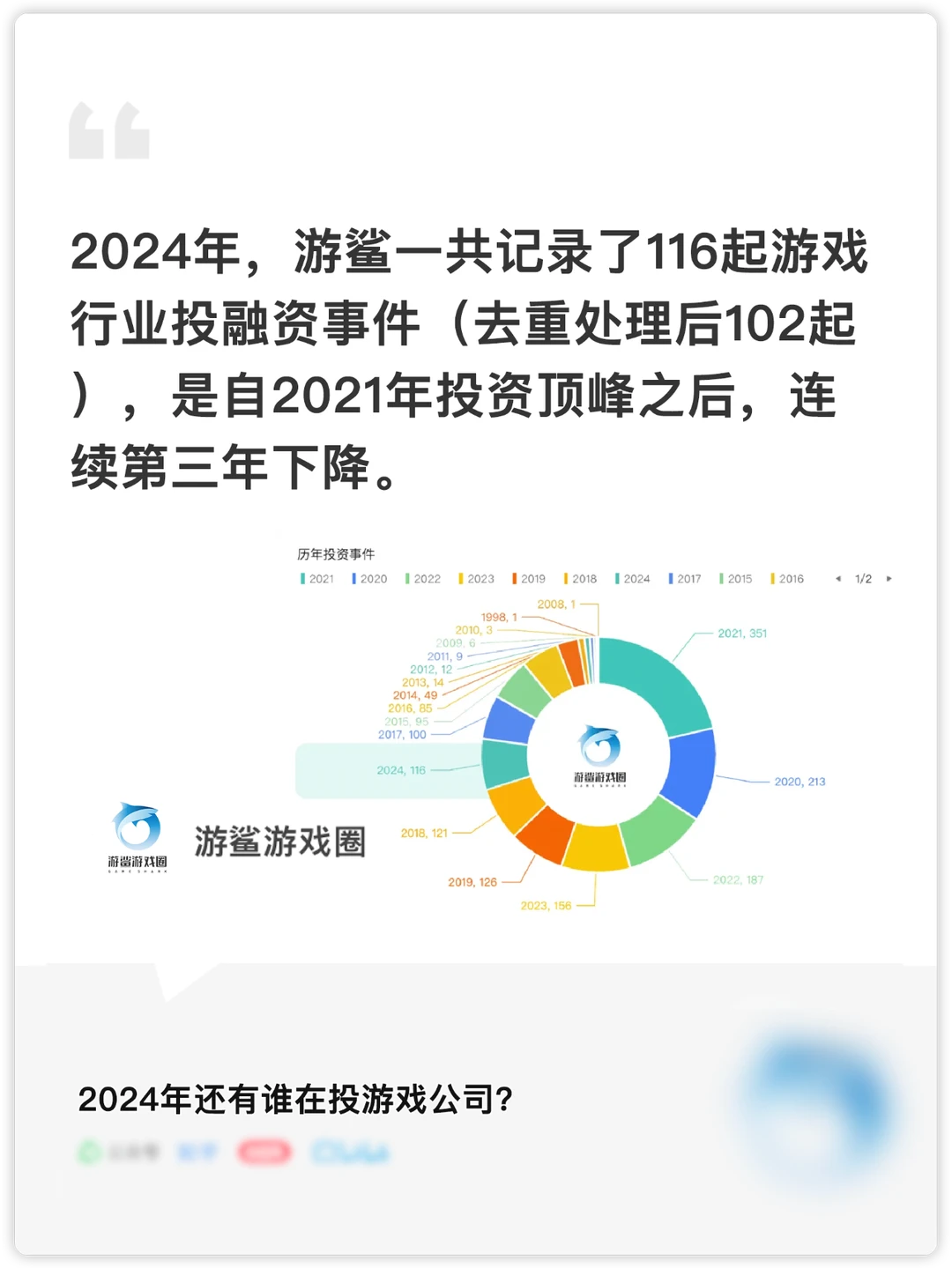 [拔草R]2024年游鲨共记录了116起投融资事件(去重后102起),这是自2021年的顶峰之后连续第三年下降。