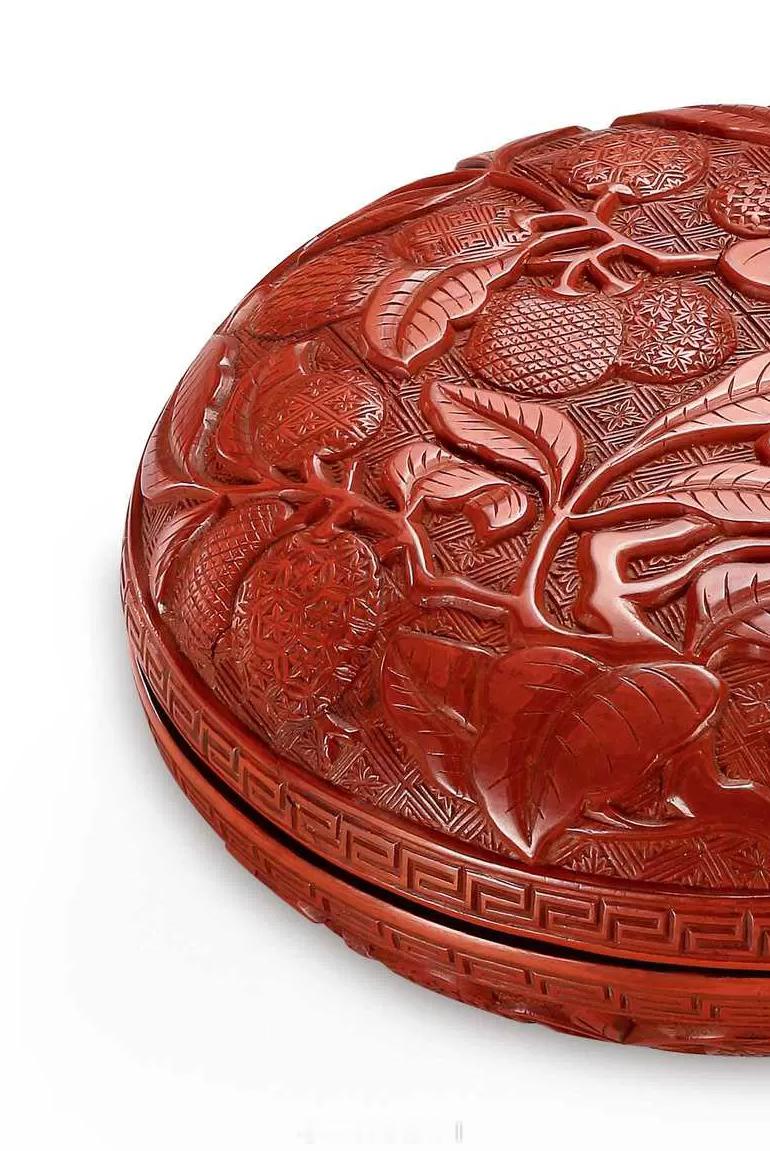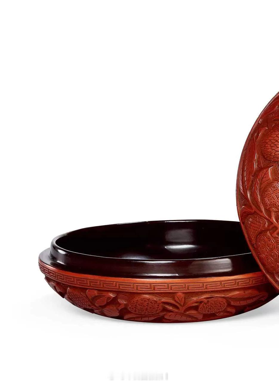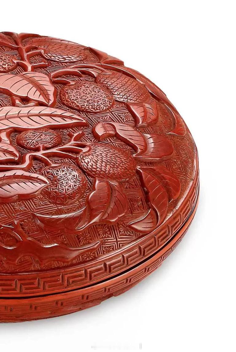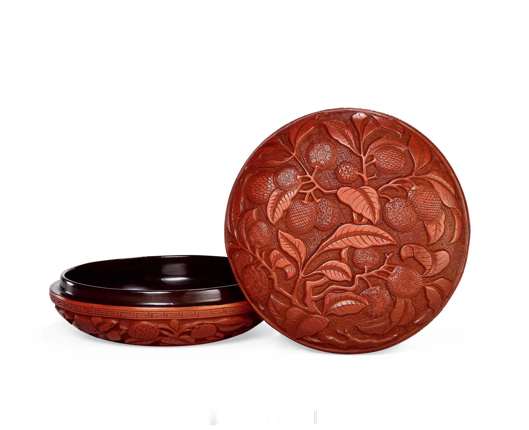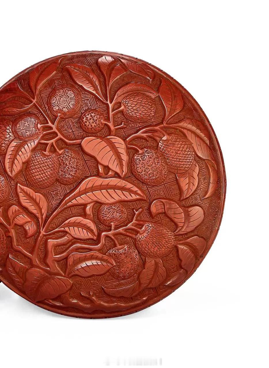髹饰录 | 明中晚期 剔红折枝荔枝图圆盒圆盒尺寸较大,造型圆浑,蒸饼式。红漆稍泛黄,质地细腻坚硬,保存完整。子母口,口沿起一周宽边雕回纹。盖顶上剔刻双菱形套枣花锦地,其上浮雕折枝荔枝图,枝干盘曲如龙,布满盖盒,叶片正反变化,硕果累累,荔枝三五一组,以不同锦地表现,有六方形套栀子花锦、斜格锦、枣花锦、菱形套卍字纹锦、十字丁香花锦、鳞片锦等。盒底隐圈足,其上雕正反三角形套半枣花锦,盒内、底髹微泛紫的黑推光漆。荔枝盒在明嘉靖、万历时制作较多。尺寸:直径16cm来源:保利2025秋拍《醉花荫—海内外名藏漆器》