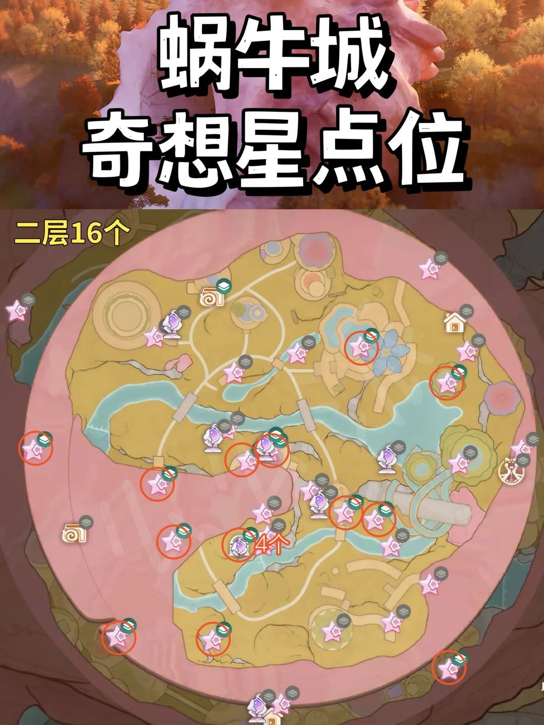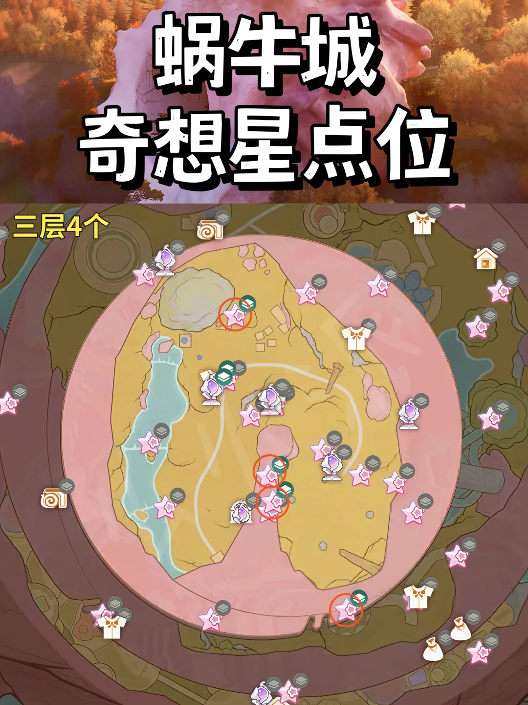 蜗牛城一层14个 蜗牛城二层16个 蜗牛城三层4个 蜗牛城壳顶2个