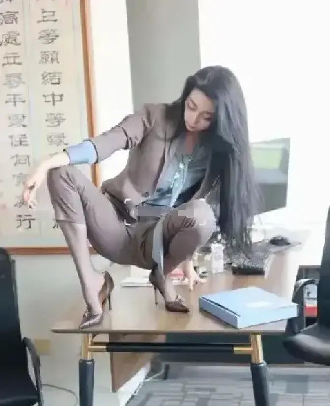 活了几十年,头回见有人在办公室把办公桌当舞台!穿西装踩高跟鞋的小姐姐直接蹲在桌面,长发披肩姿态利落,背景的书法字画衬得这场景又怪又。