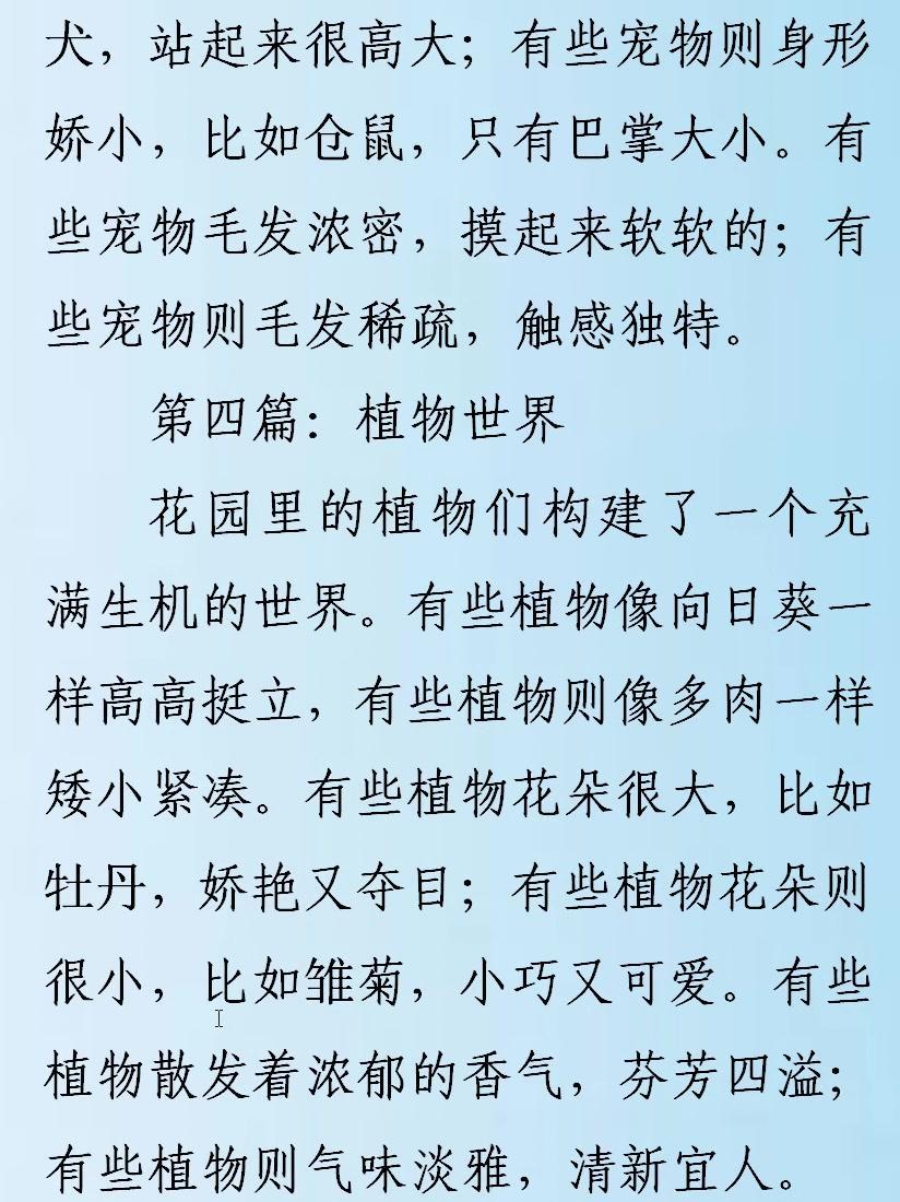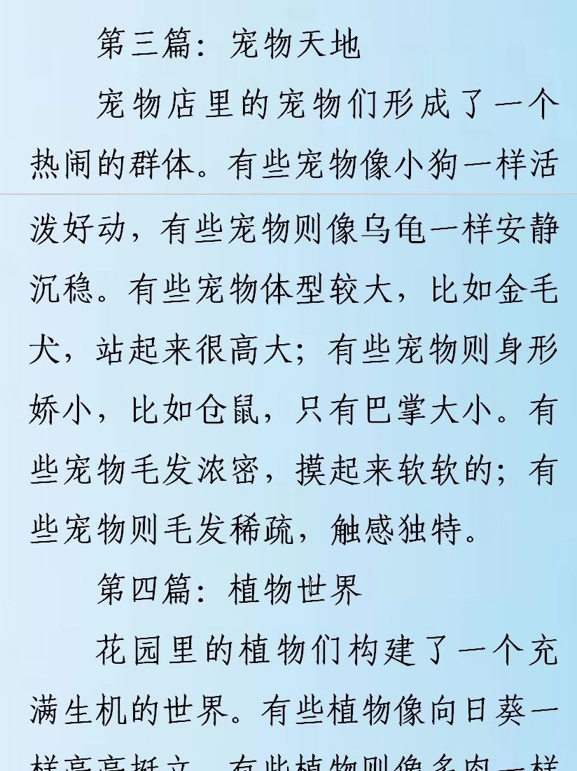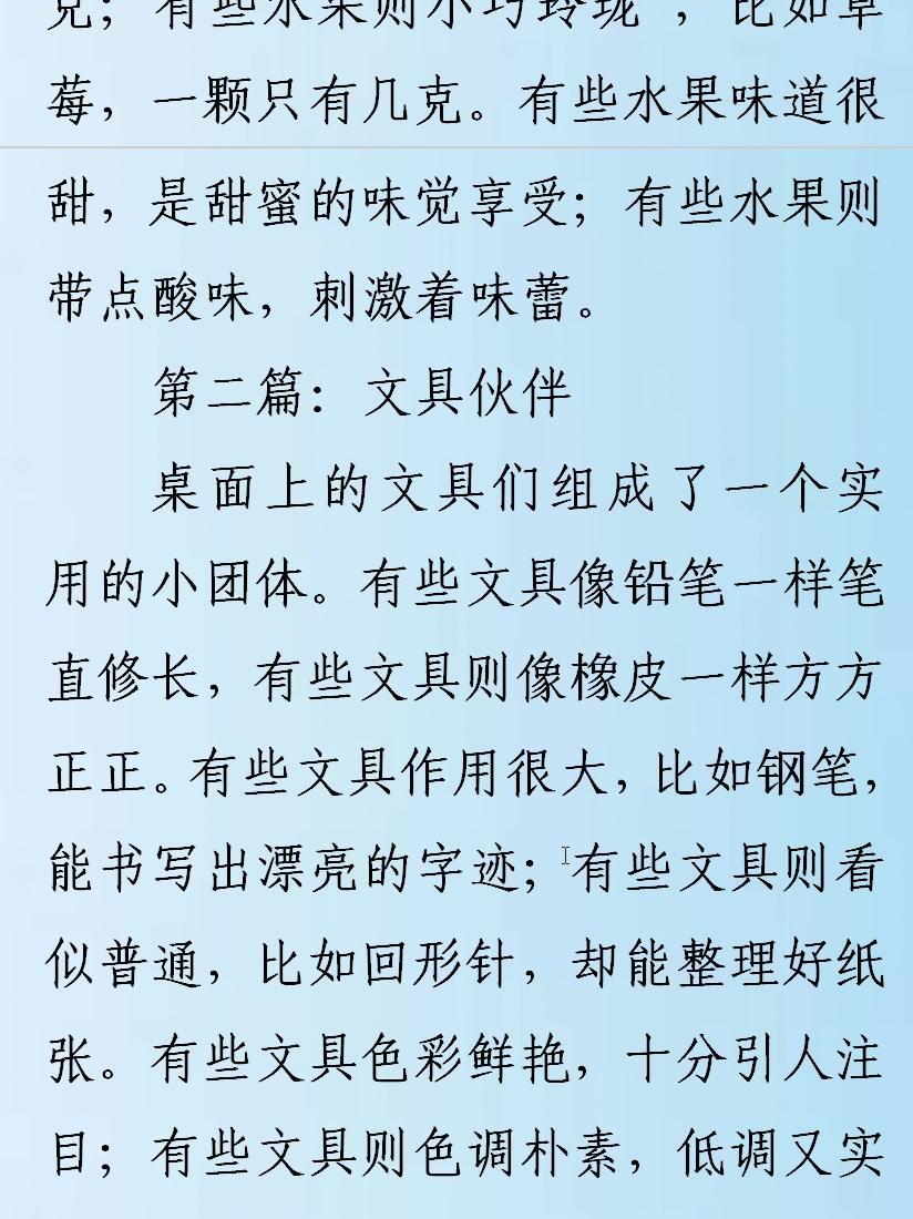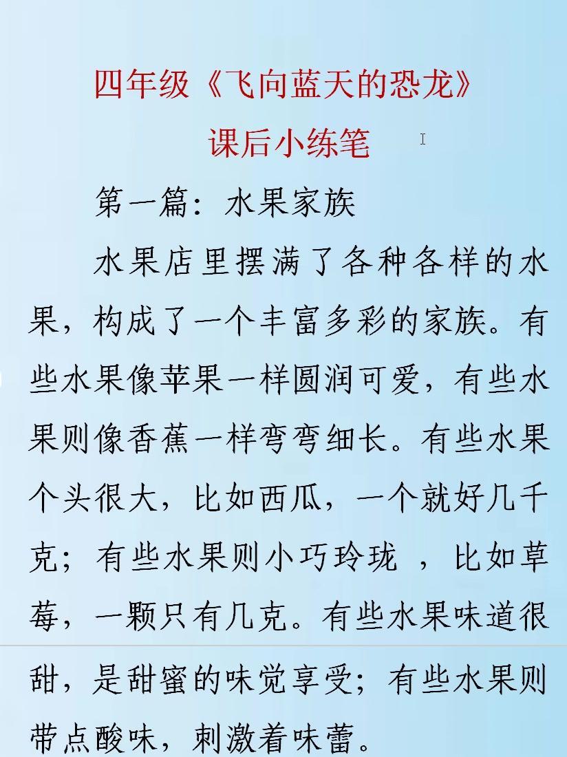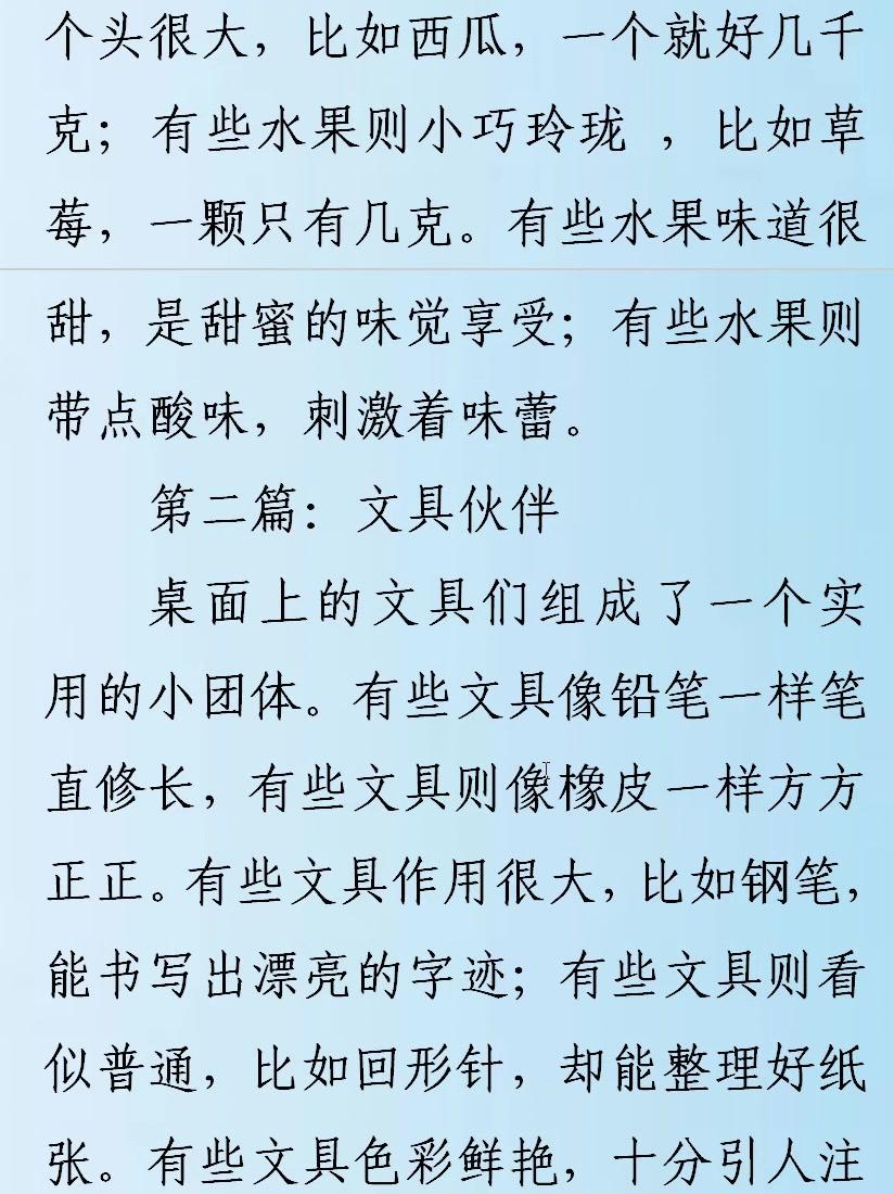 ✨重点:让孩子学会用对比。 范文:水果店里有各种各样的水果,构成了一个丰富多彩的家族。有些水果像苹果一样,是圆圆的,很可爱。有些水果像香蕉一样,是软软的,细细的。有的水果个头很大,比如西瓜;有的小巧玲珑,比如草莓。西瓜很大很重,草莓小巧玲珑,只有几克。水果味道不一样,有的很甜,有的酸酸的。