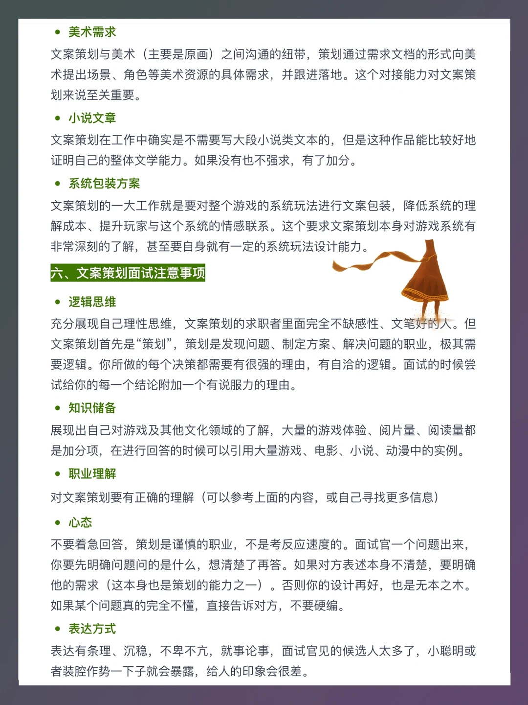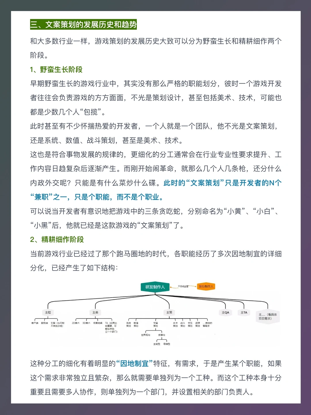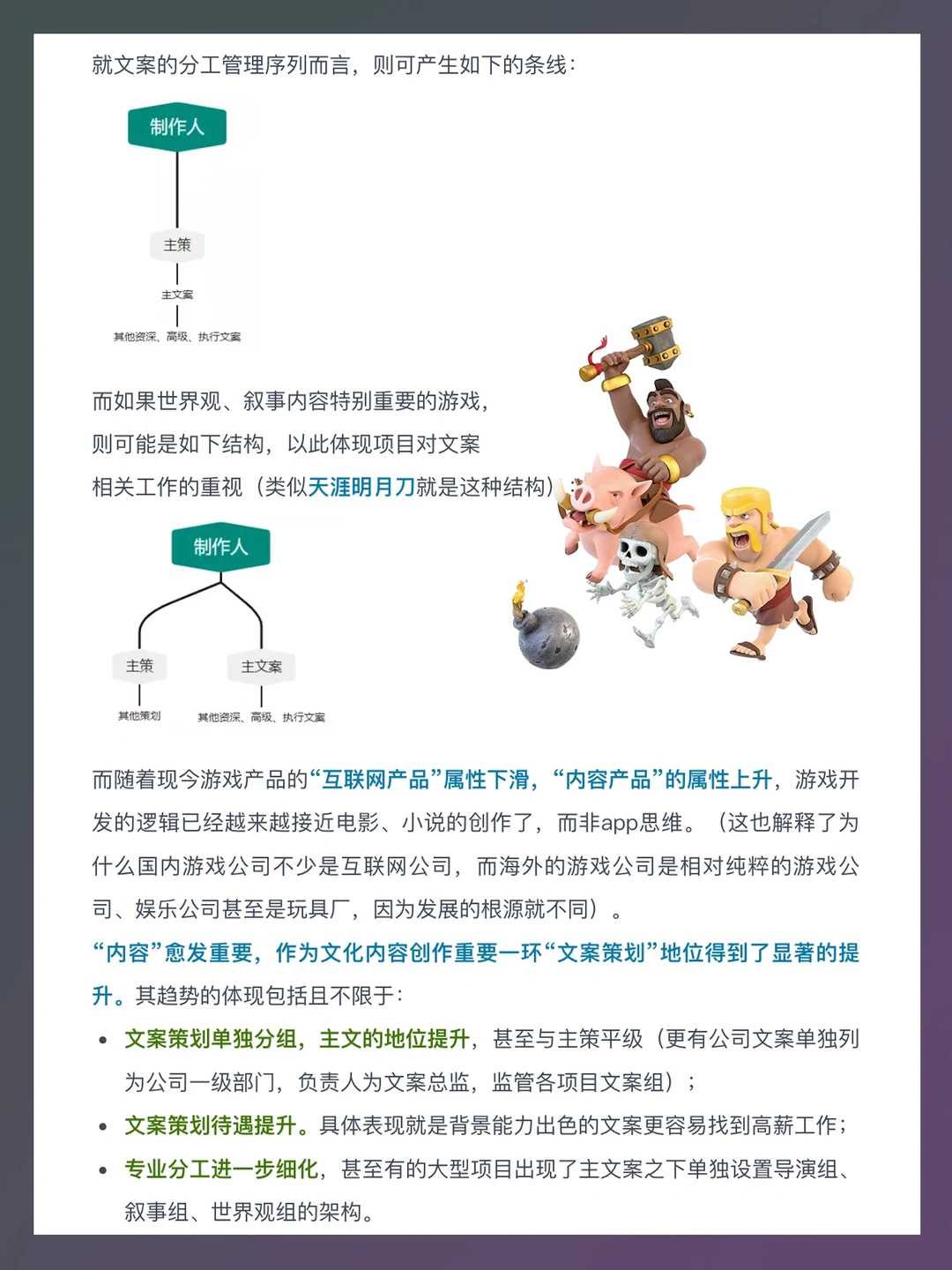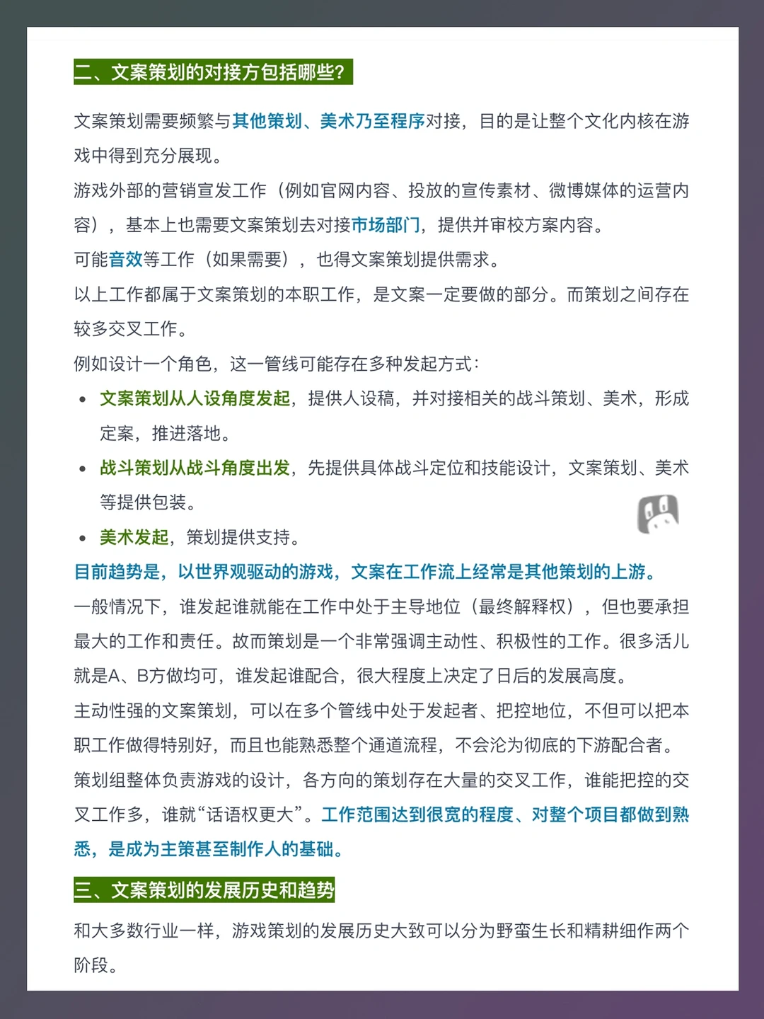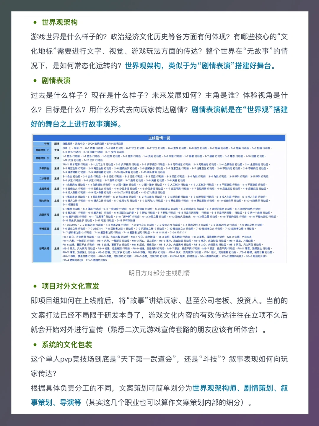 随着现今游戏产品的“互联网产品”属性下滑,“内容产品”的属性上升,游戏开发的逻辑已经越来越接近电影、小说的创作了,而非app思维。“内容”愈发重要,作为文化内容创作重要一环“文案策划”地位得到了显著的提升。 本篇笔记就来介绍一下游戏文案策划,主要包括以下内容:游戏文案策划工作内容、文案策划的对接方、发展历史和趋势、能力要求、求职(简历和作品准备、面试注意事项)等。