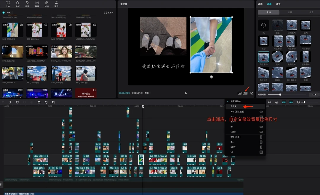 5⃣️依据歌词卡点插入图片或视频素材到轨道条,可以先大概按时间顺序插入,后续再进行微调,点击播放器右下角的“适应”,自定义自己的视频比例(也就是屏幕尺寸比例);