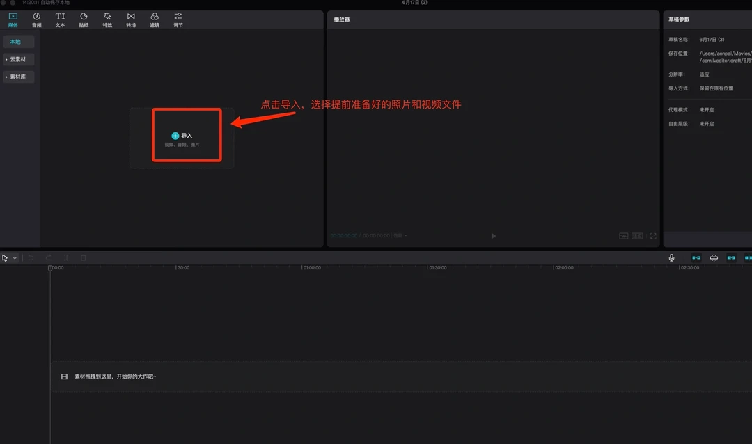 1⃣️打开剪映电脑版,点击“开始创作”建立画布,导入图片素材和音频文件至素材画版;