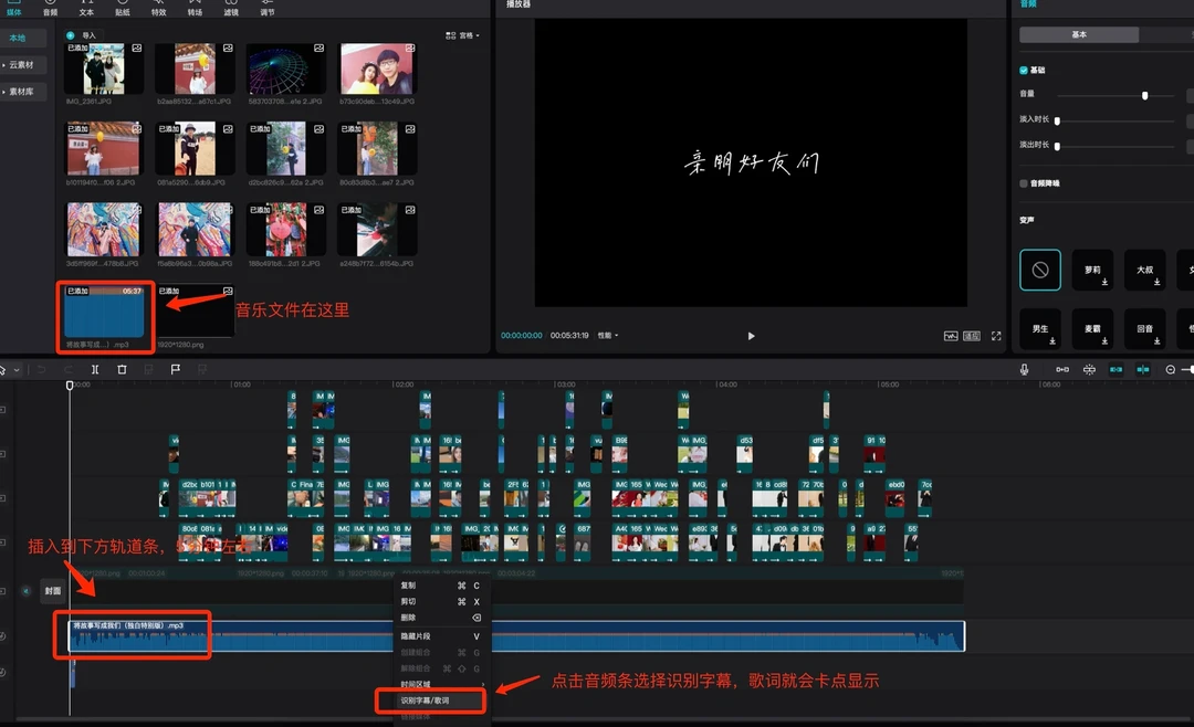 2⃣️将导入的音乐插入到轨道条,点击“识别字幕/歌词”,歌词就会依据卡点显示;