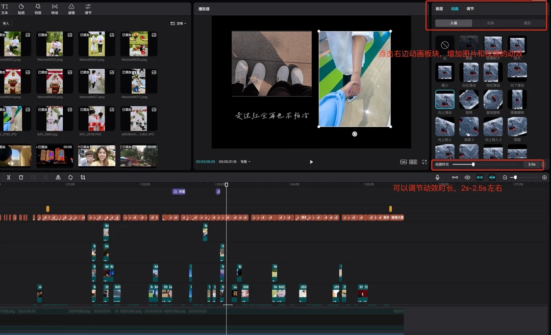 6⃣️整体图片和视频插入完成后,为图片和视频增加动效(动效时长依据自己喜好调整,本人经验大概1.5~2.5s的时长效果最好);
