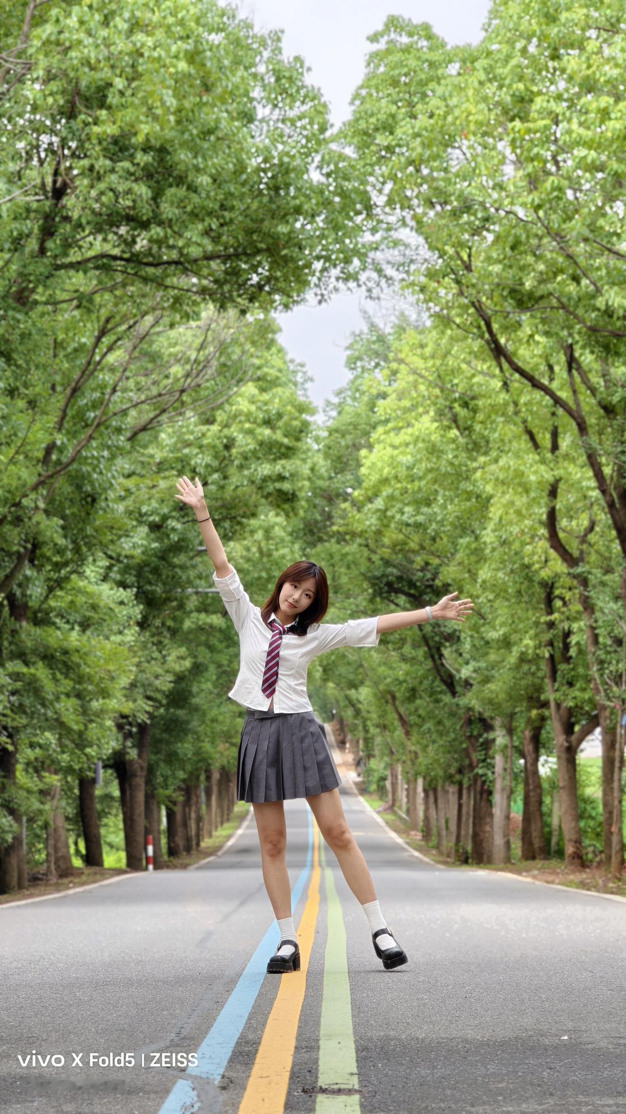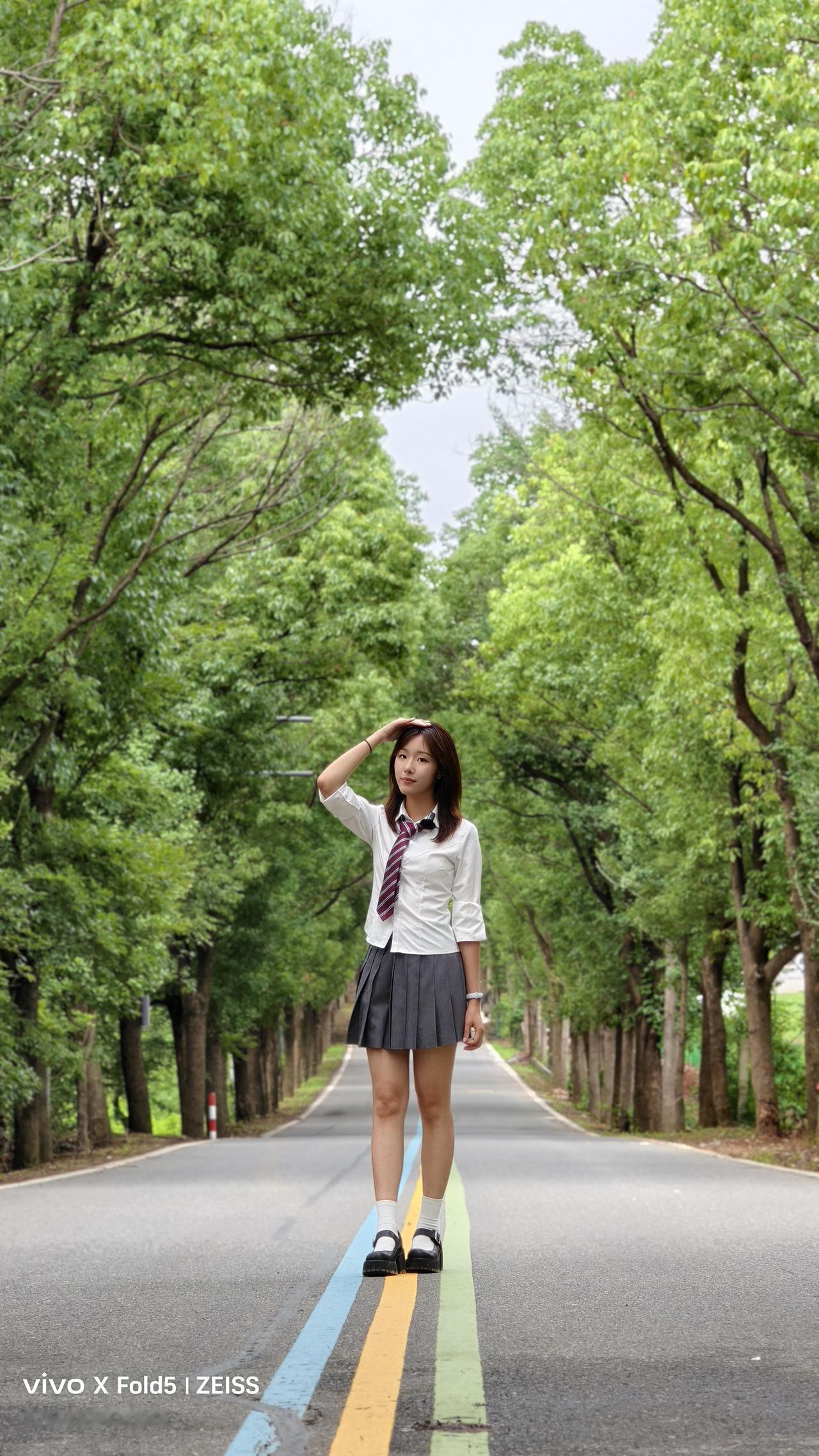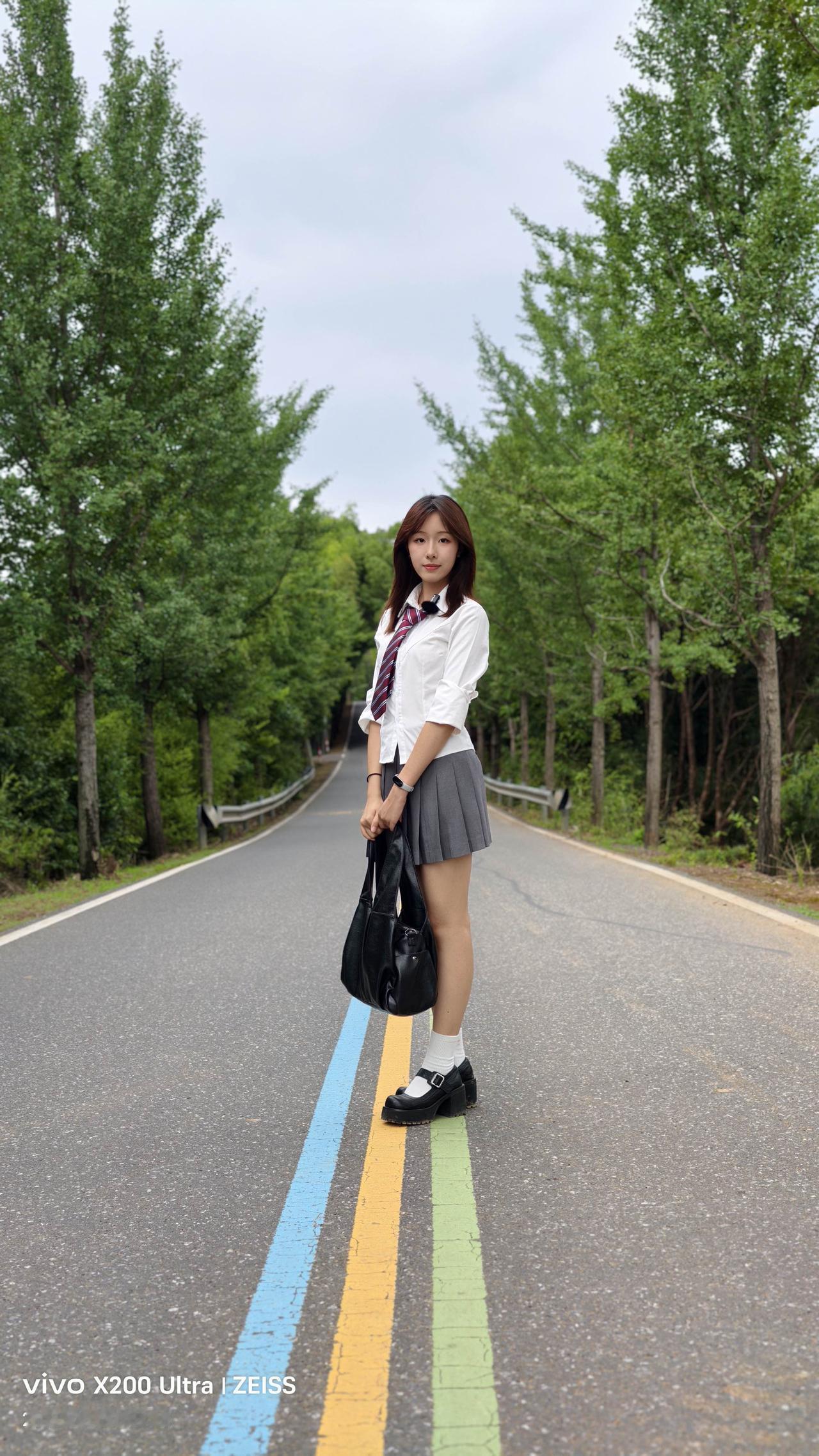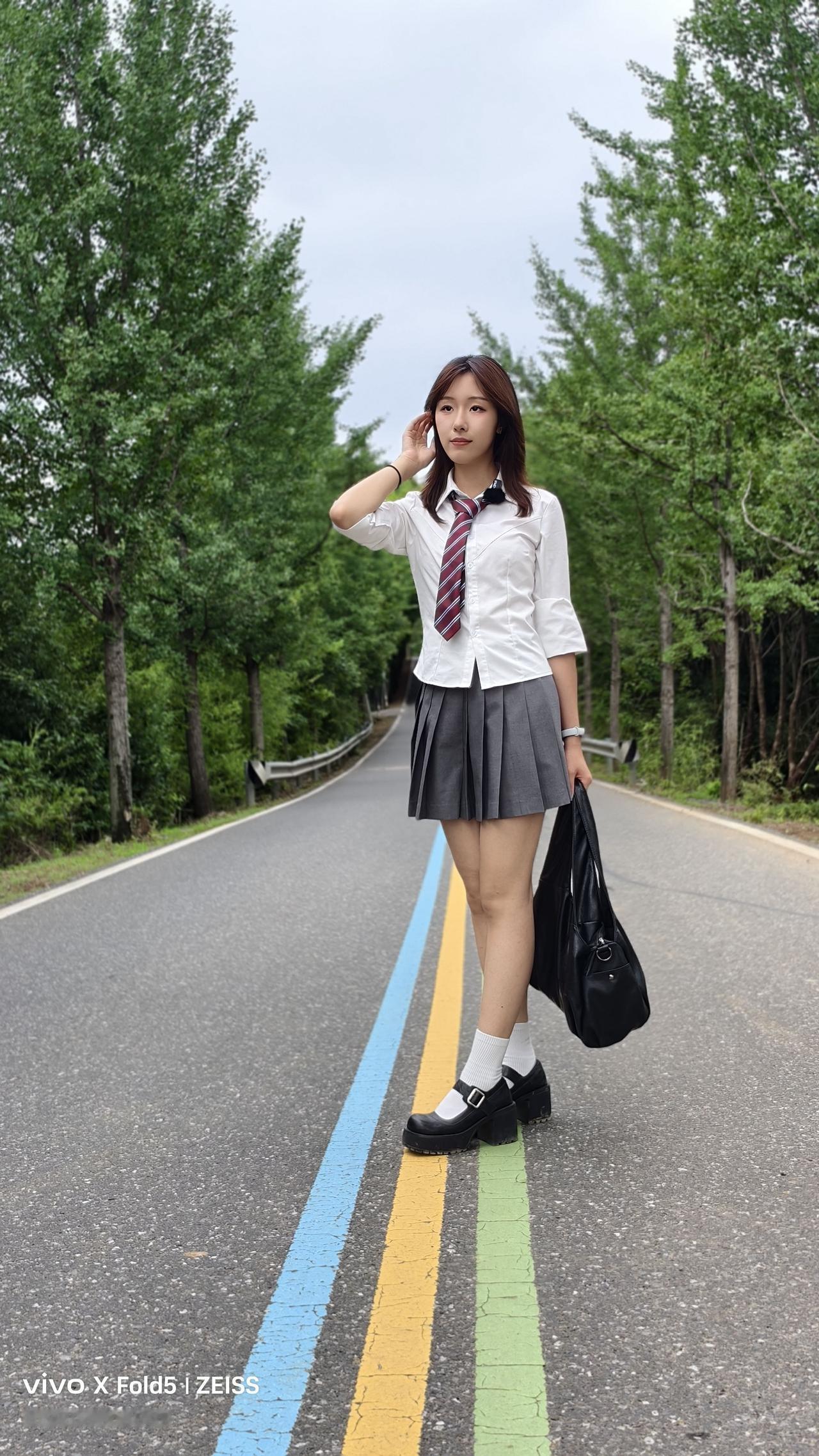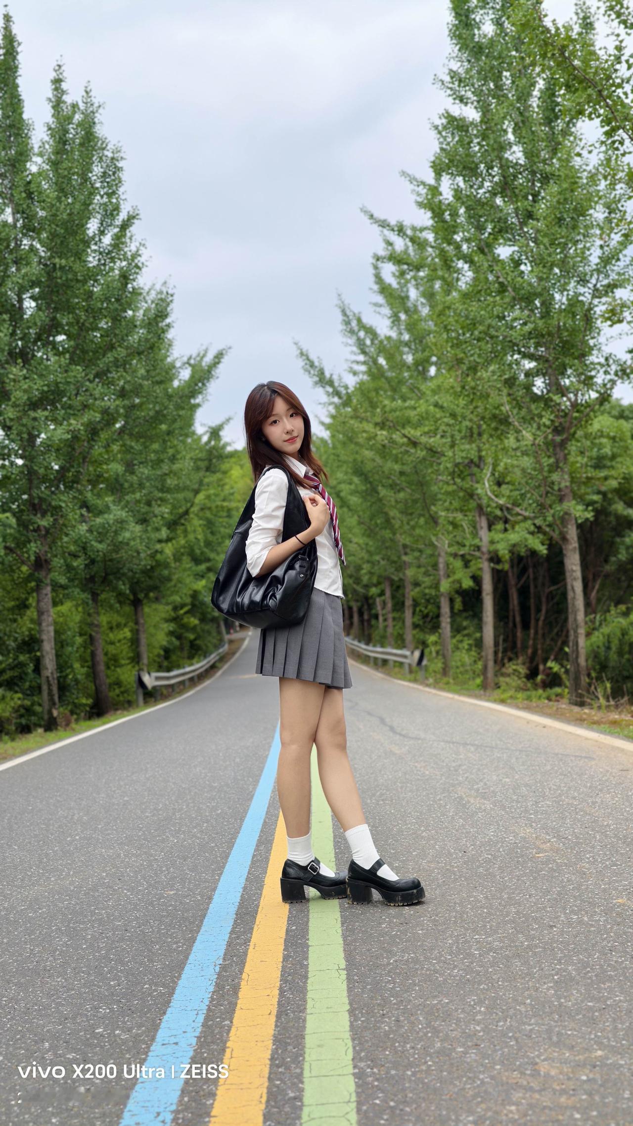 青春校园风,少女漫步在林荫小道上,背着书包,脚踩黑白皮鞋,清新自然。