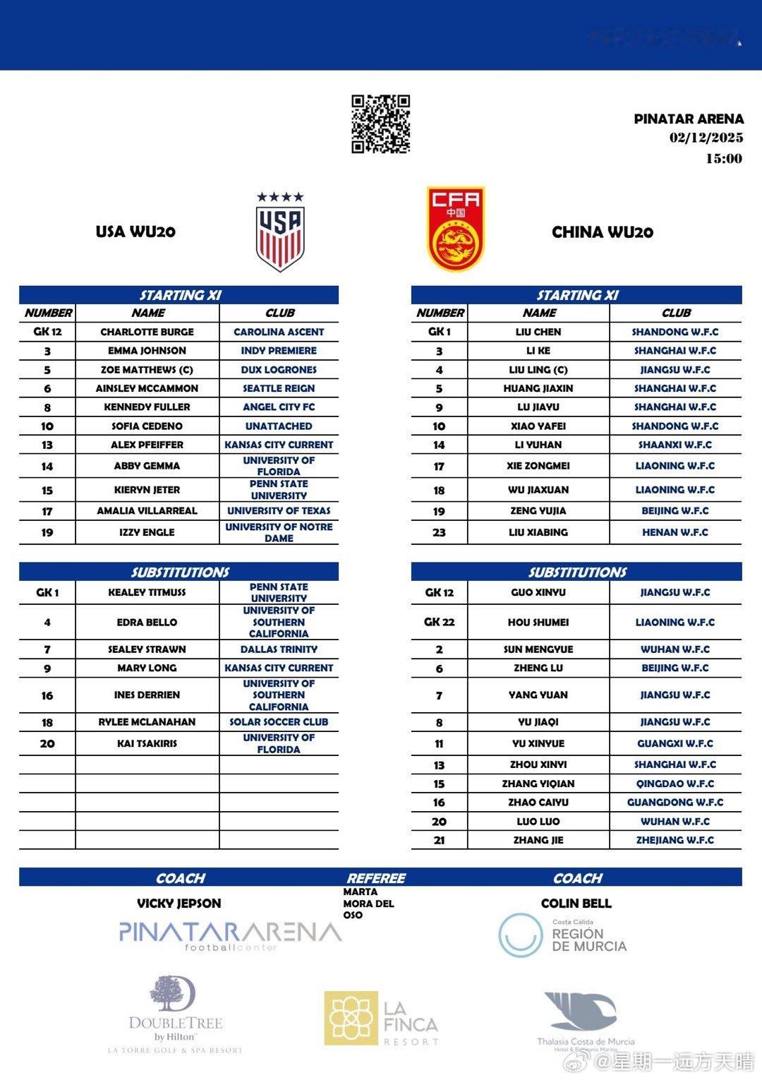 辽宁女足中国女足 【吴佳璇、谢宗梅首发】【侯舒楣替补】西班牙友谊赛:中国U20女足VS美国女足U20比赛时间:今天北京时间22:00无转播。