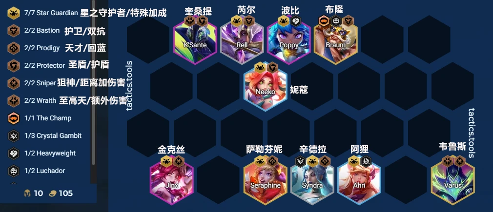 羁绊机制类似冒险家/天将。每个星之守护者弈子登场后全队获得其专属增益。